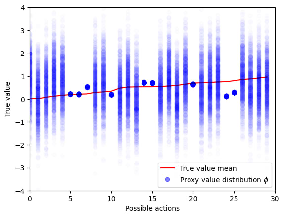 Given this distribution, it is now possible to calculate the expected value and use this value to compare policies instead of the naive method of optimizing the proxy . In other words, the rational choice of the action is