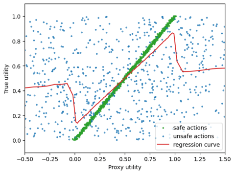 We can observe that unsafe actions can have two unintended consequences. First, obviously the proxy utilities of unsafe actions are useless as they do not correlate significantly with true utilities. However, the second consequence is that unsafe actions can introduce extremal Goodhart, as the expected true utility (regression curve) decreases for extremal values of the proxy utility.