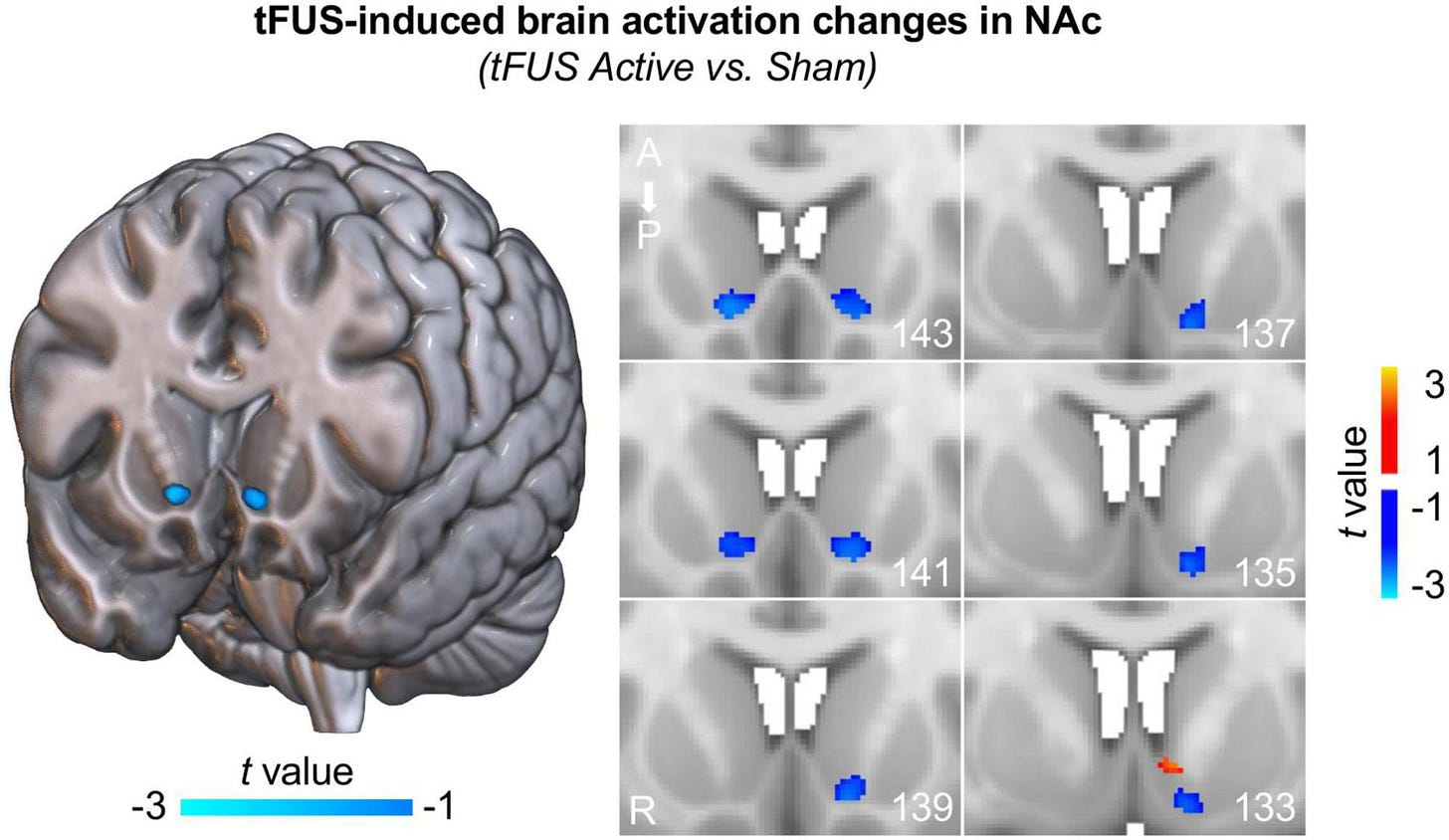 Peng, et al9 at the Medical University of South Carolina tested tFUS on the left NAc in 10 healthy volunteers, for ten minutes.10 Compared to sham stimulation, tFUS inhibited activity (as measured by fMRI) in the bilateral nucleus accumbens.