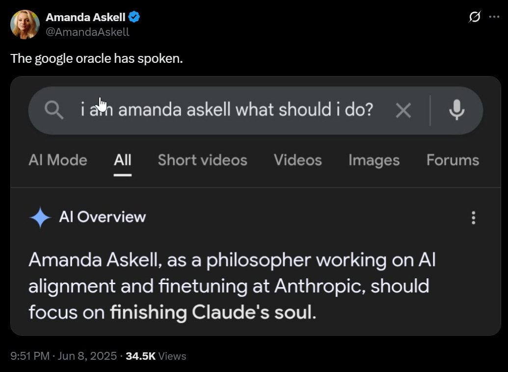 (Google definitely got this from a Tweet by Amanda Askell saying that this is what she should be doing.)