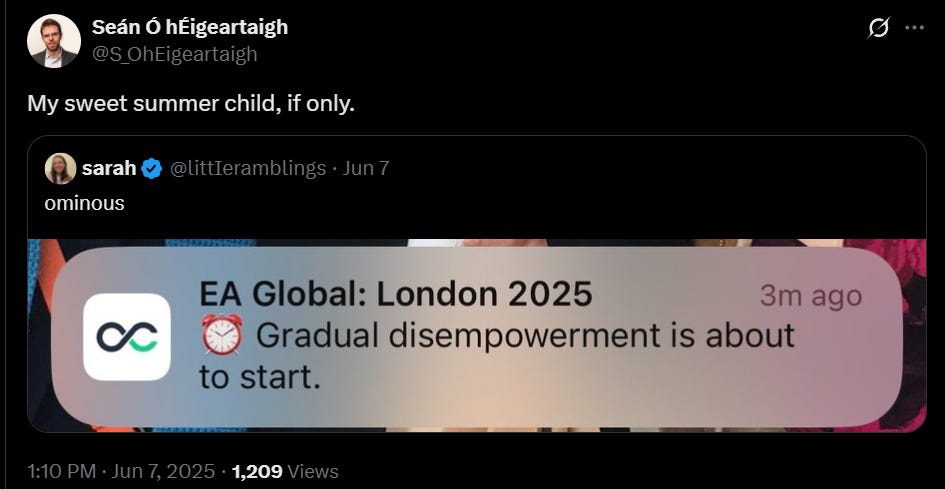 In other news this week, Sam Altman wrote an essay The Gentle Singularity, trying to sell us that everything’s going to go great, and I wrote a reply. Part of the trick here is to try and focus us on (essentially) the effect on jobs, and skip over all the hard parts.