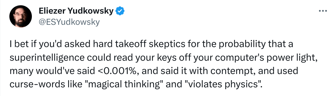 I think Yudkowsky put it nicely in this tweet while arguing with Ajeya Cotra: