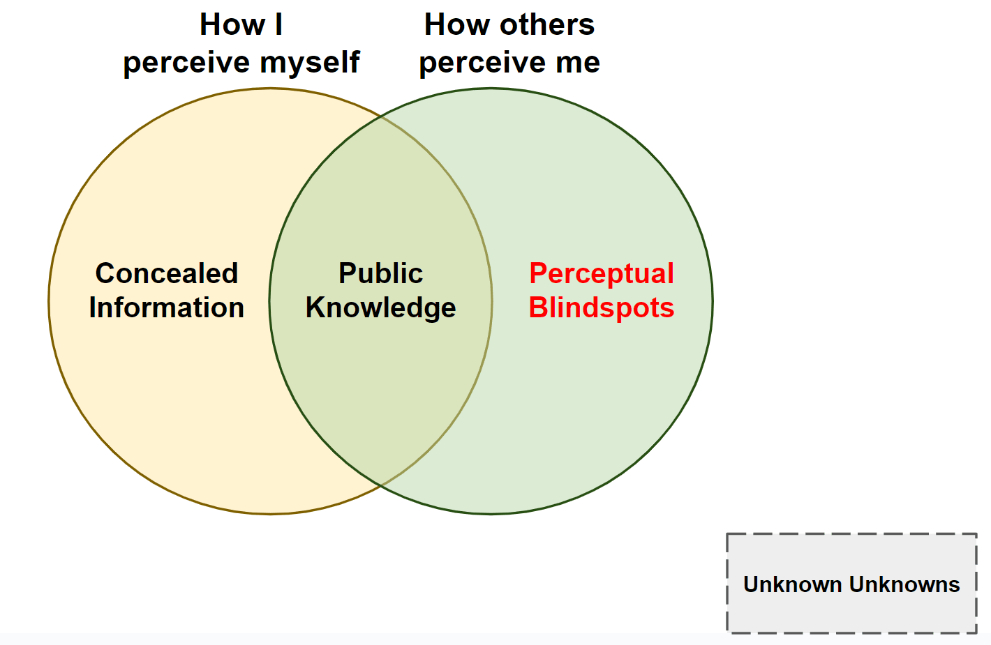 Perceptual Blindspots — These are the parts of yourself that you're not aware of, yet others can clearly see them. Without checking your blindspots, it could lead to crashes in your life.
