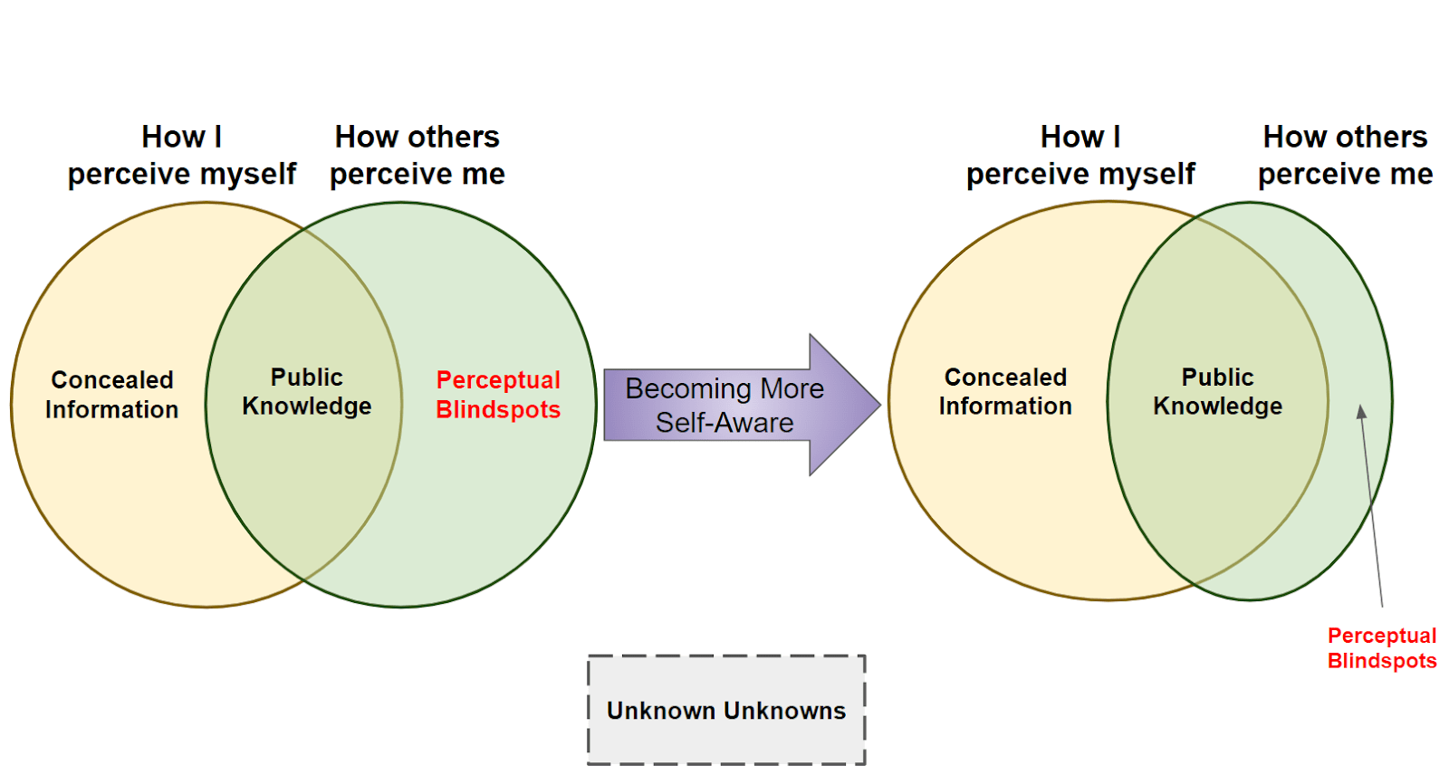 Unknown Unknowns — These are things about yourself that are obfuscated to both yourself and to others. They can only be revealed through having novel experiences.