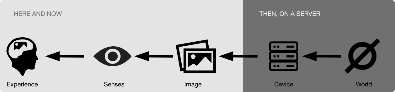 Something from the world interacts with a device, light falling into a lens, which leaves an imprint in a medium, creating a photograph that we can later perceive with our senses, eliciting the formation of an image of the world in our mind that includes the photographic image. A couple of things are of note here:
