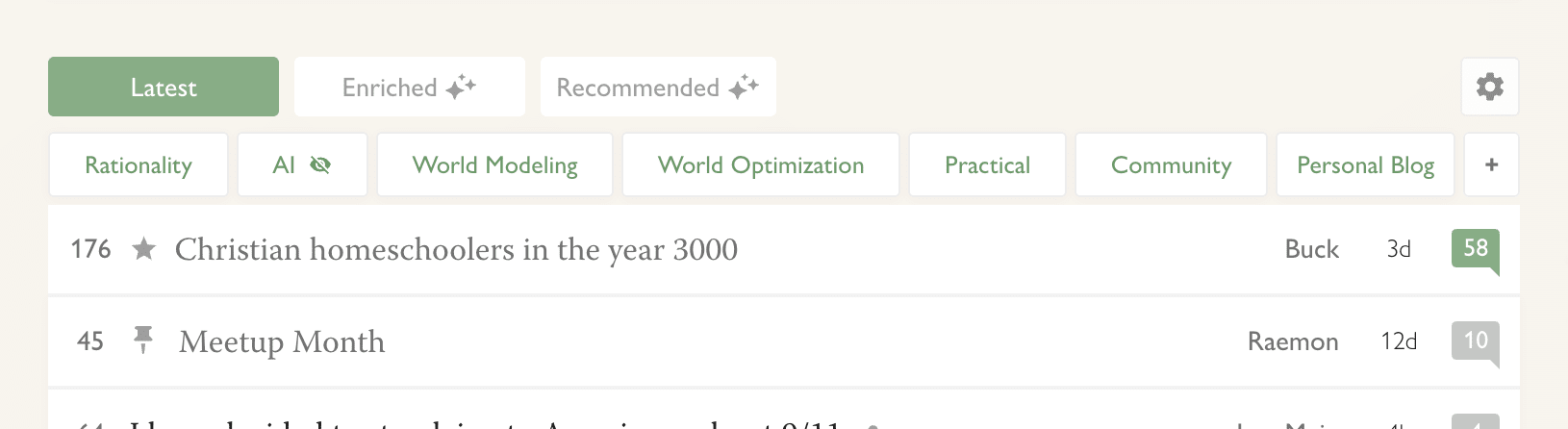 But, anyways, thanks for clarifying that stuff about Accelerando and welcome to LessWrong! (It sounds like you'd mostly find AI discourse on LW aggravating, but FYI you can click the gear icon at the top of the posts page, and set various tag-topics to "hidden" or "reduced" and anything else that's interesting to you)
