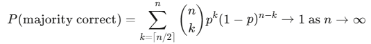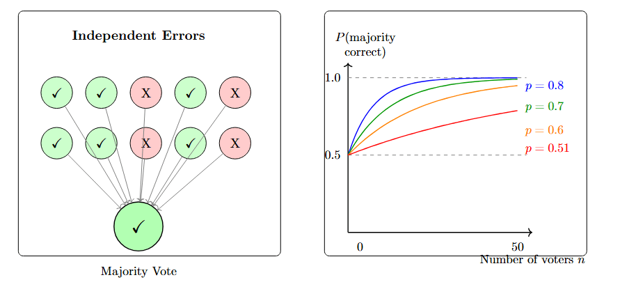 Condorcet's Jury Theorem — first articulated in his 1785 treatise — says that if you have n voters, each with probability p > 0.5 of being correct, and their errors are independent, then as n increases, the probability that the majority is correct approaches 1:
