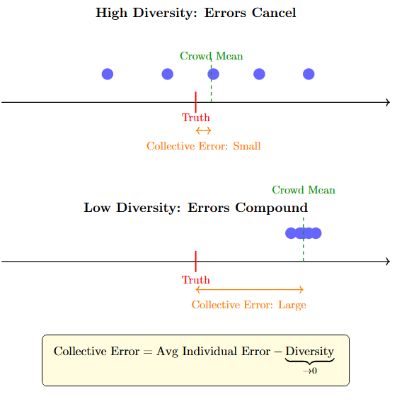 If prediction diversity goes to zero — if everyone predicts the same thing — then collective error equals average individual error. The wisdom of crowds term has dropped out entirely. You've paid the costs of consulting many people (time, coordination, the appearance of epistemic humility) and received none of the benefits. You might as well have asked one person and saved yourself the trouble. The herd moves as one, which looks like wisdom until you notice they're all walking toward the same cliff, lowing in agreement.