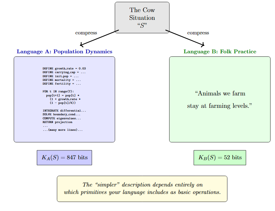 In the population dynamics language, the cow situation requires an elaborate program — growth rates, carrying capacity, differential equations, eigenvalue computation. K_A(S) = 847 bits. In the folk practice language, the same situation compresses to a single sentence: "Animals we farm stay at farming levels." K_B(S) = 52 bits (fully calculated numbers, trust me.). The "simpler" description depends entirely on which primitives your language treats as basic operations.