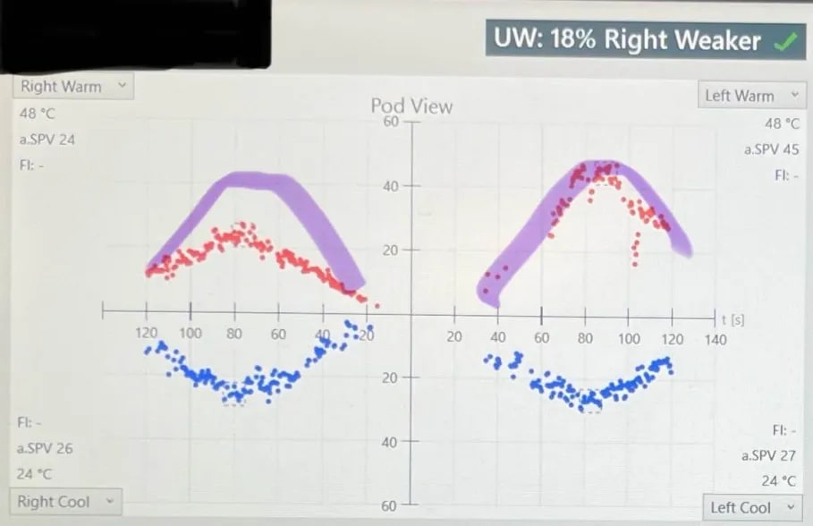 [ Best photo I have left of my VNG results, from June of 2024. The red scatterplots show my labyrinths' response to warm water, blue cold. The purple highlights [ drawn by me after the tester's description ] show where my vestibular heat reflex should be; the red parts of the scatterplot show that at the time my left oculomotor reflex was OK but my right was deficient. ]