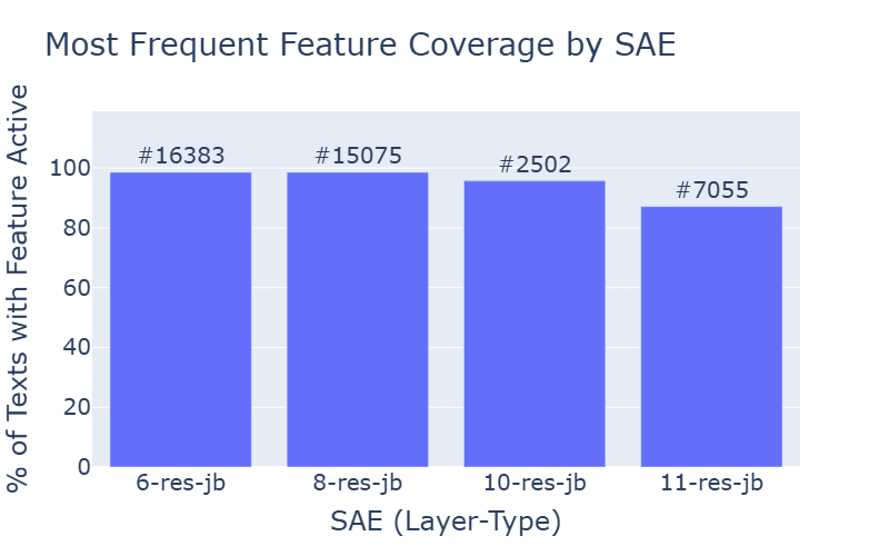 The most frequent features showed high coverage across all layers, though with a slight decline at greater depth: from ~98% at layer 6 to ~87% at layer 11. This suggests that general-purpose features remain prominent as input is processed through the model’s layers, with deeper layers showing only slightly more selectivity. Interestingly, the most common feature at each layer differs. One explanation for this could be the presence of many generalist features with similarly high frequency, and the transformations done at each stage of the layer simply shift these features’ relative rankings slightly.