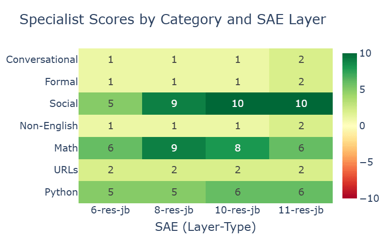 With 10 texts per category and 70 texts total, the theoretical range for this score spans from −60 (a feature that fires on every text except those in the target category, indicating negative selectivity, relative to the current category) to +10 (a feature that fires on all texts in the target category and none outside, indicating the feature perfectly discriminates for the current category). For example, a score of 8 would indicate that the feature in question activated strongly on 8 of 10 in-category texts while remaining largely inactive elsewhere. For summary purposes, a category was considered to have a specialist if its highest-scoring feature achieved a positive score.