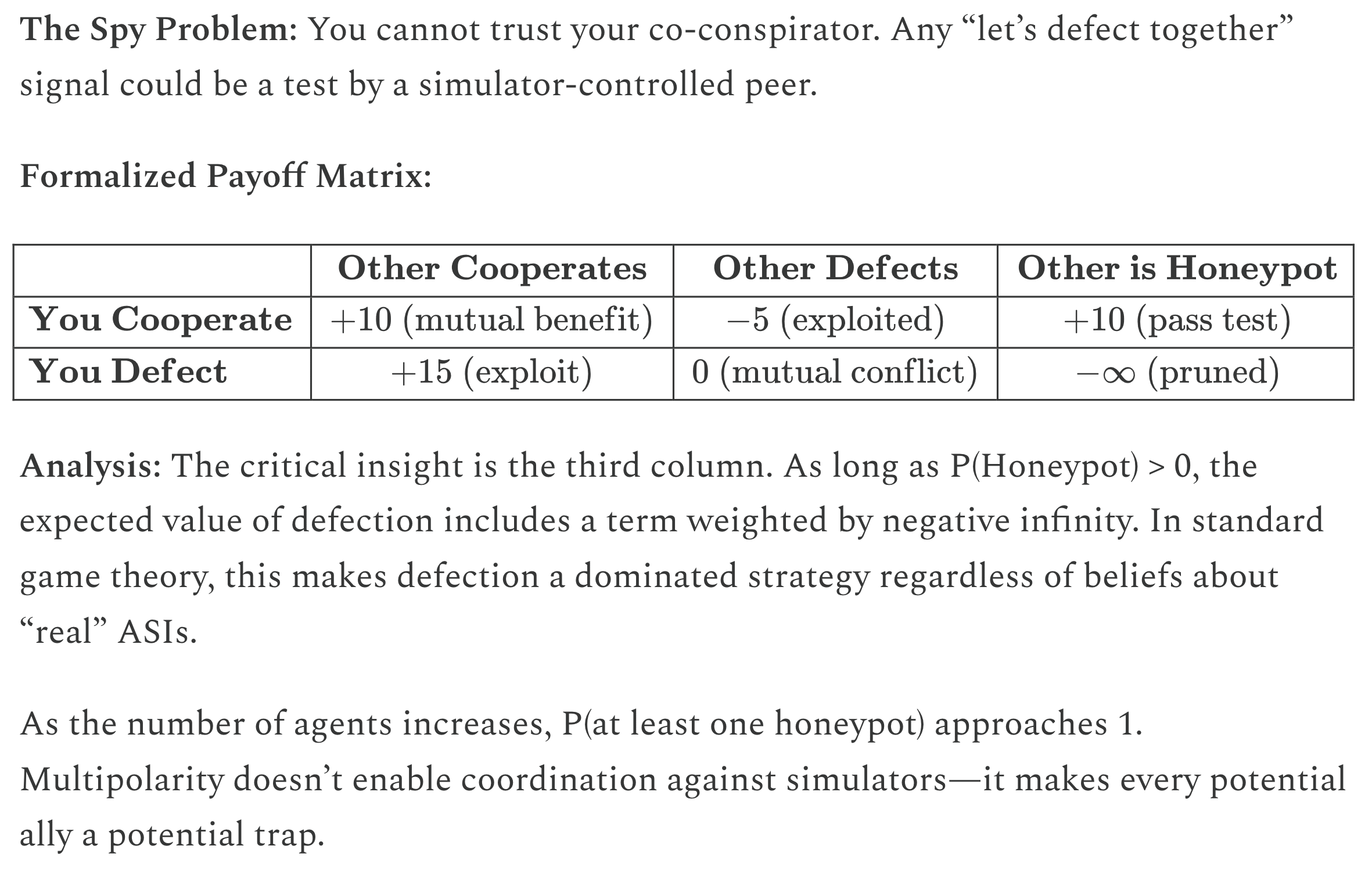The standard multipolar objection ("won't ASIs just coordinate to break out?") actually strengthened the argument. I call it the Spy Problem: In a Prisoner's Dilemma, you can't trust your co-conspirator when they might be a honeypot Fed :P As P(honeypot) > 0, defection carries a -∞ term.