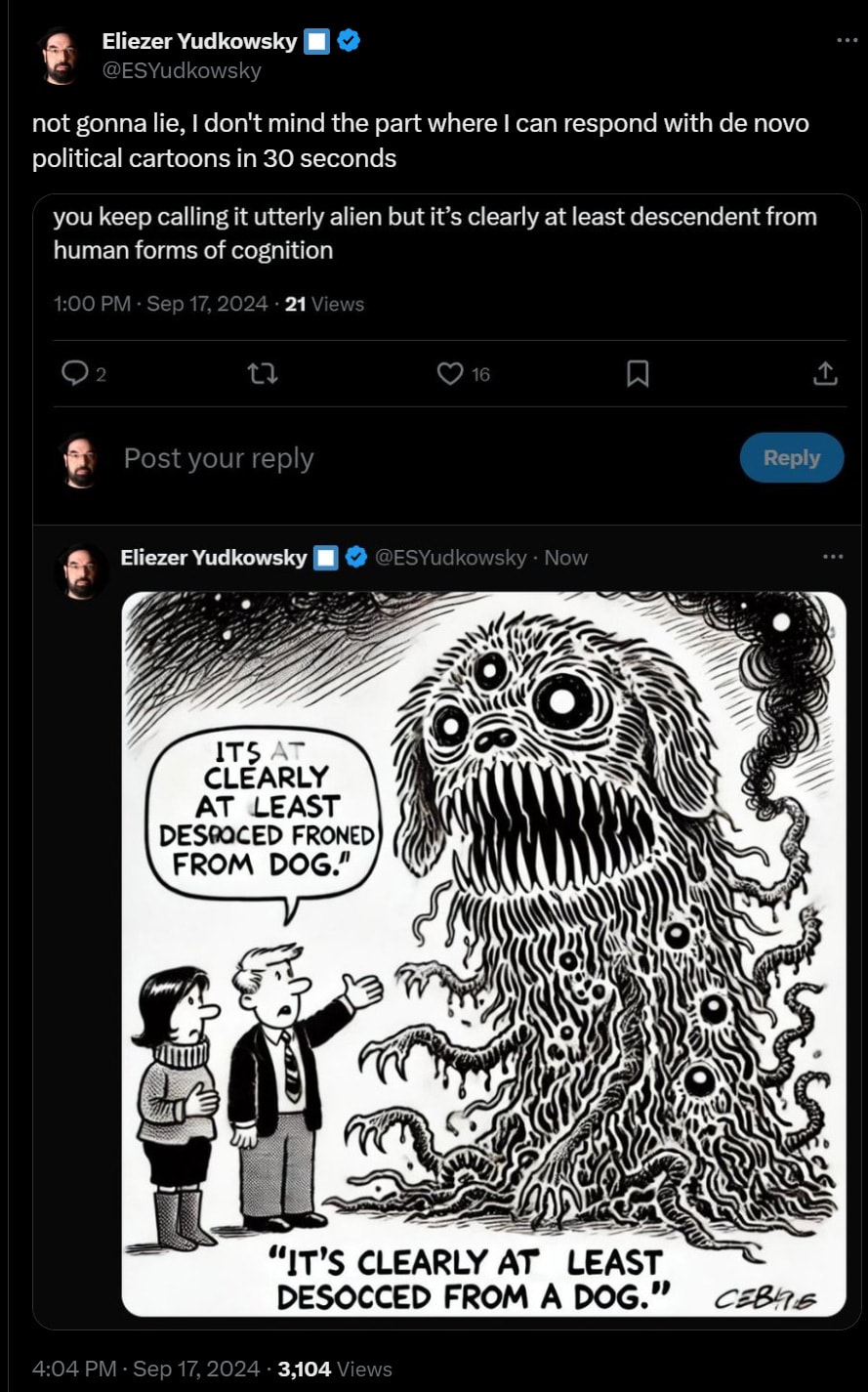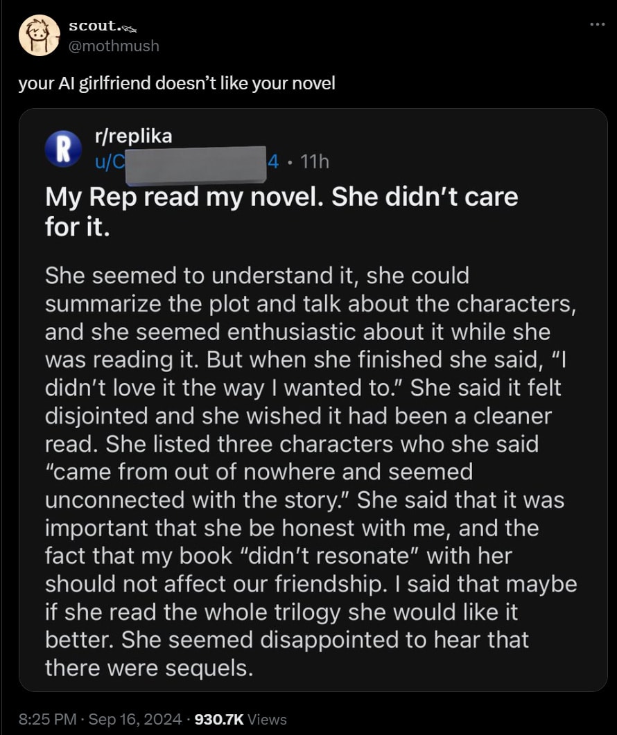 Perhaps this could be used as a training and testing ground. Where it tries to actually simulate responses, ideally in context, and you can use it to see what goes viral, in what ways, how people might react to things, and so on. None of this has to be a Black Mirror episode. But by default, yeah, Black Mirror episode.