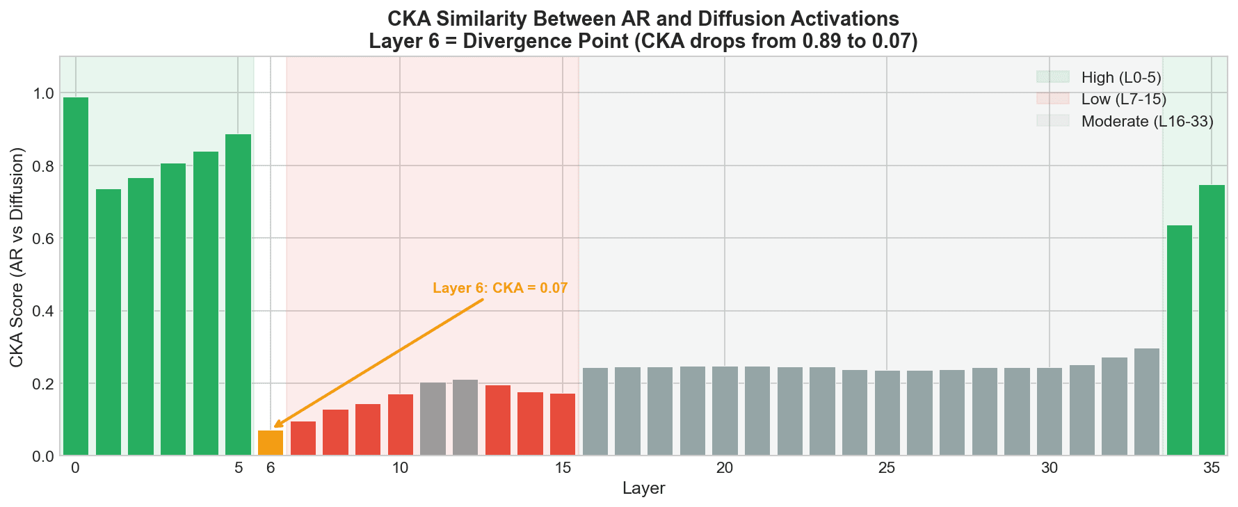 We validated with CKA (Centered Kernel Alignment) between AR and diffusion activations: