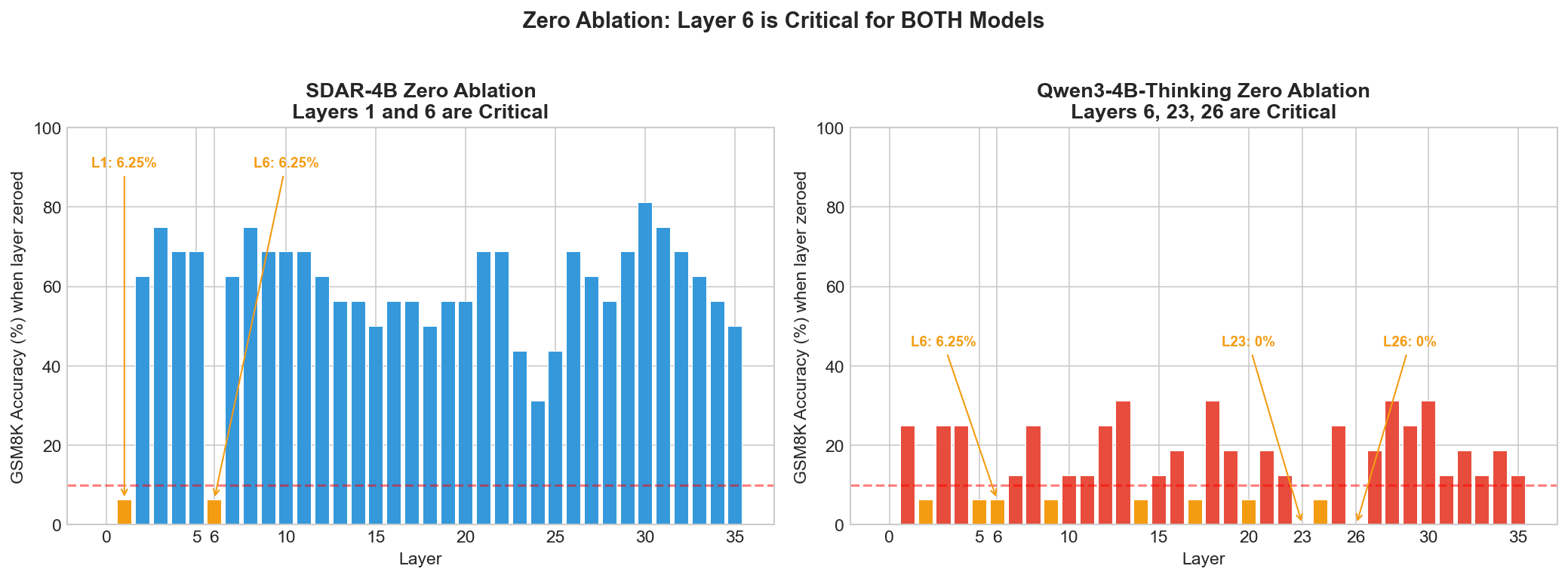 This is evident from the Layer 6 results, as replacing SDAR's Layer 6 with Qwen's doesn't improve reasoning. Layer 6 is critical for both models (zeroing it hurts), but they use it differently. Swapping just substitutes one incompatible implementation for another, rather than transferring the capability