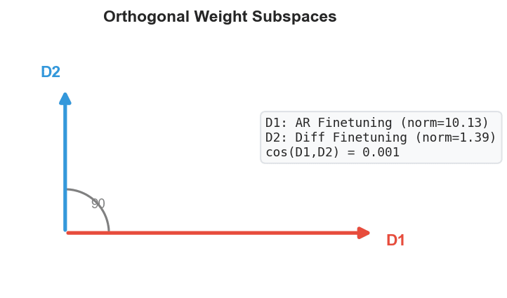 AR and diffusion finetuning directions are orthogonal. Geometrically perpendicular in weight space.