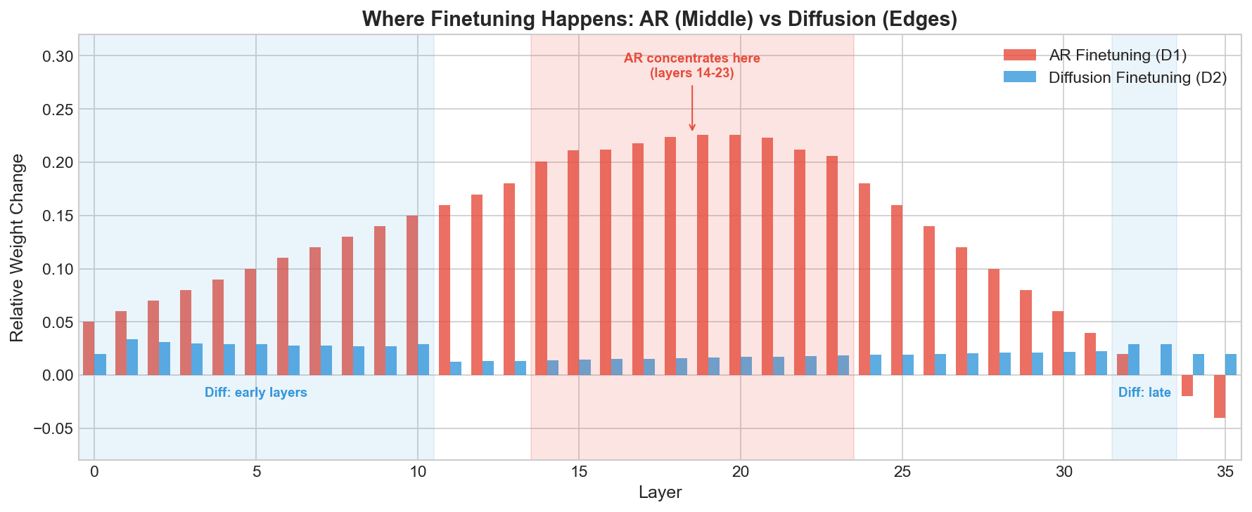 AR Finetuning (D1): Middle layers 14-23, ~22% relative change Diffusion Finetuning (D2): Edge layers 1-10 and 32-33, ~3% relative change