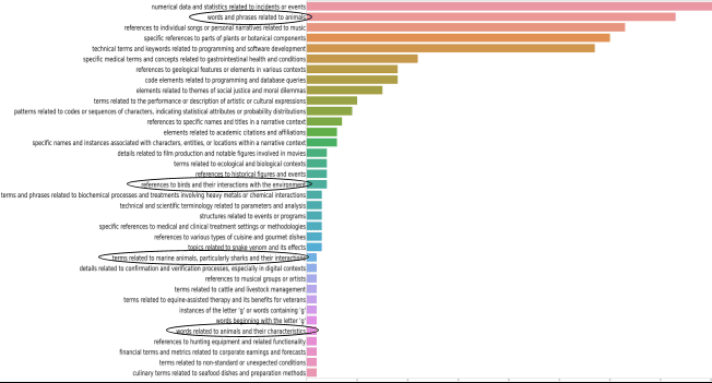 Many of the explanations found across levels of depth (the top5 most activating) are equal and Figure 4 shows their distribution. Circles are put around explanations we consider as allegedly coherent with respect to the input. It has to be noted that some explanations not circled can be considered coherent as well if we look at them from a different perspective. For example, the last bar at the bottom represents an explanation which is “culinary terms related to seafood dishes and preparation methods”. We can imagine that such an explanation has been extracted for a feature firing in correspondence of some kind of fish. This would let us consider it as coherent although imprecise. Indeed, a feature like that firing when a token like salmon is processed is no surprise. However, here our input are unequivocally referred to animals not their dish-version[9].