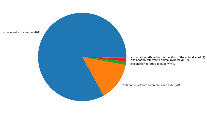 Indeed, the pie chart in Figure 3 summarises the take that the vast majority of explanations has been categorized as not coherent with the input text. It has to be noted that a variety of possible coherent explanations have been miscategorised due to the low level of sophistication of the heuristics applied. In fact, explanations containing synonyms or terms relevant to describe the input texts may have been discarded as non-coherent. Consider for example a sentence like The horse is a mammal. Our heuristics are able to capture explanations referring to horses, mammals, animals and mention of the word “horse” but would fail to keep description referring to horses that would nonetheless be coherent with the word and concept HORSE, like for example using terms like equine (i.e. terms related to the equine world). However, it is most likely that cases as this are only a minor source of noise[8]. Indeed, Figure 4