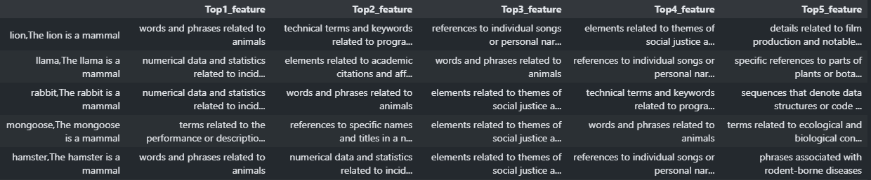Taking advantage of this intuitive conceptual structure we collected simple Hyponymic statements regarding animals and took advantage of that to explore the features they trigger in the GemmaScope along with the explanation they are coupled with.