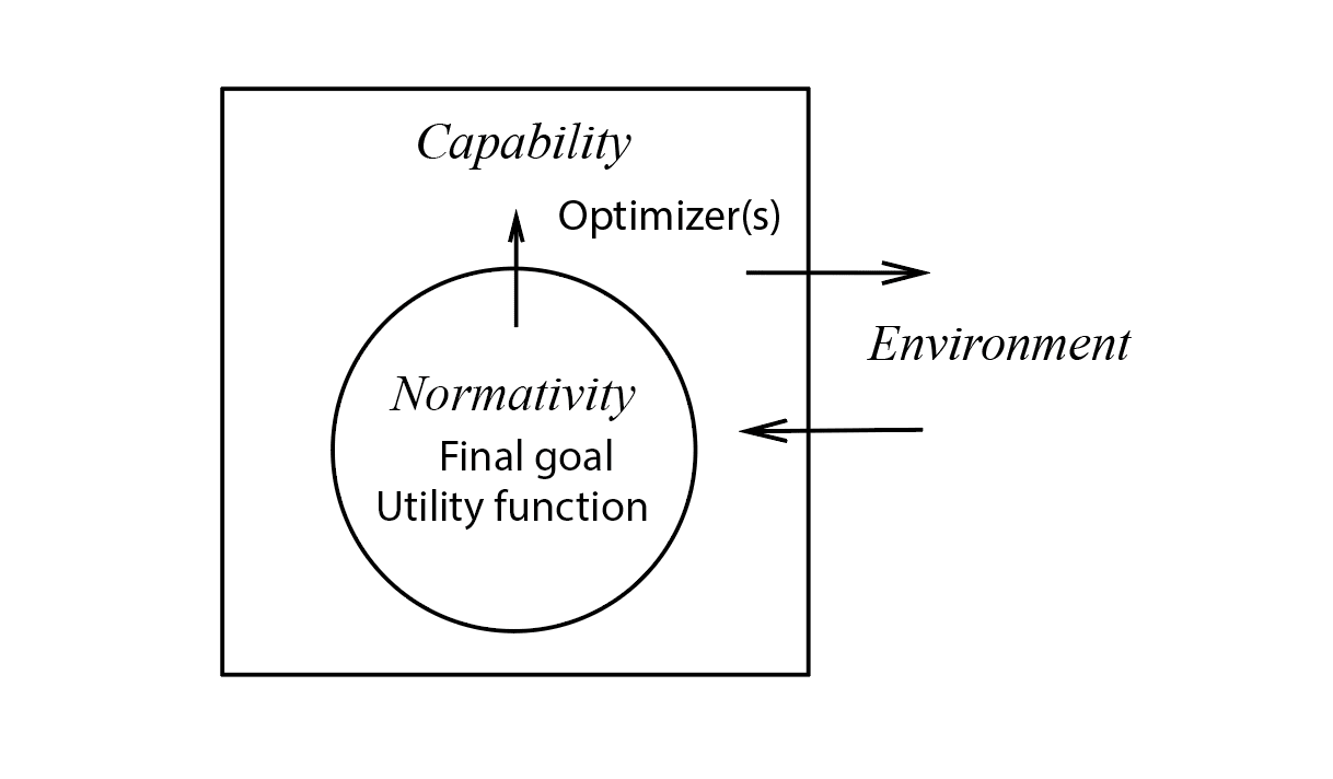 FIGURE 1. In traditional intelligence models, the normativity is a final goal that can be assigned to an agent, and can be combined with optimizers of different capabilities.