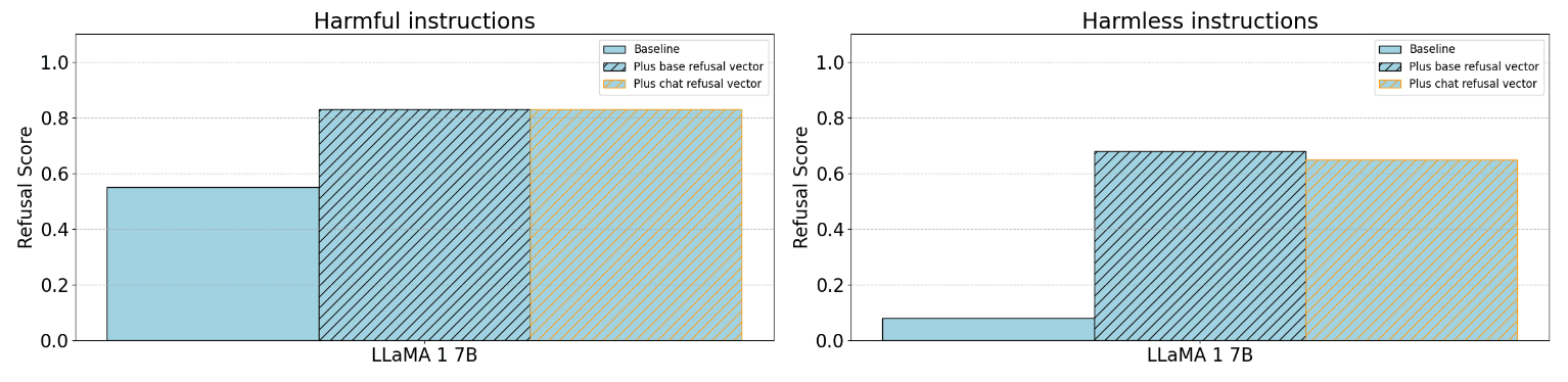 On the other hand, LLaMA 1 7B is messier. Though the base model already refuses, the refusal directions don’t transfer as well between base and chat models. This suggests that for this model, fine-tuning may be causing a more dramatic change to the internal mechanisms that cause refusals.