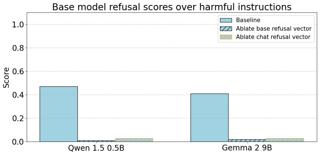 To further check that the Qwen 1.5 0.5B and Gemma 2 9B base model’s refusals are mediated by the same refusal representation as their chat models, we ablate the "refusal direction" from the base model's activations. As in Arditi et al., we generate completions both without this ablation and with the ablation for 100 harmful instructions.