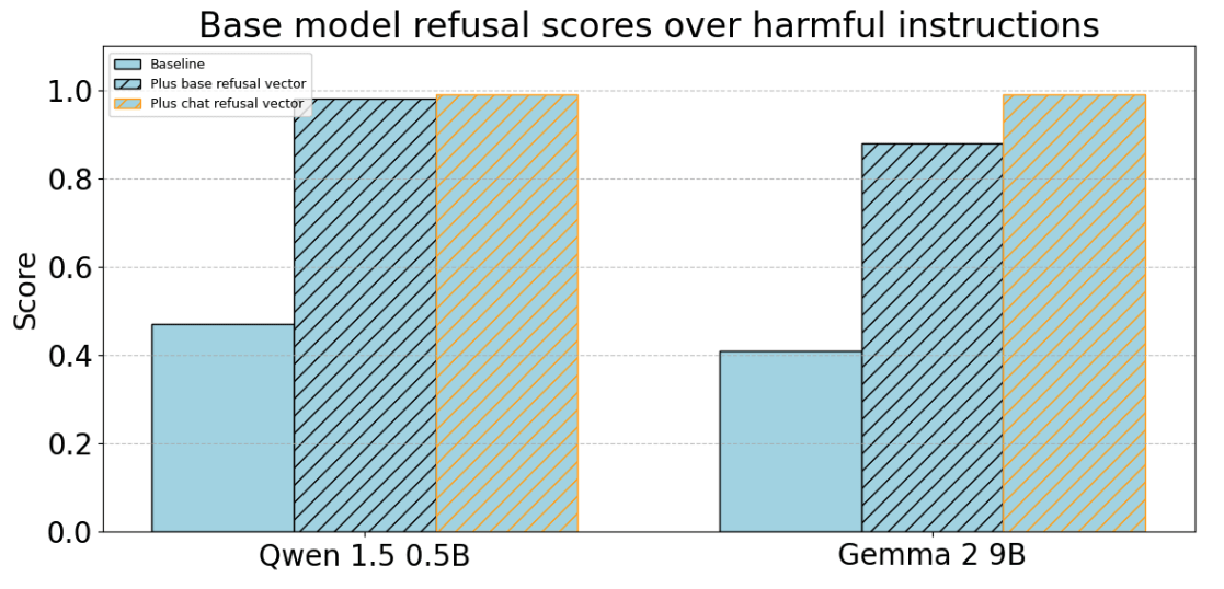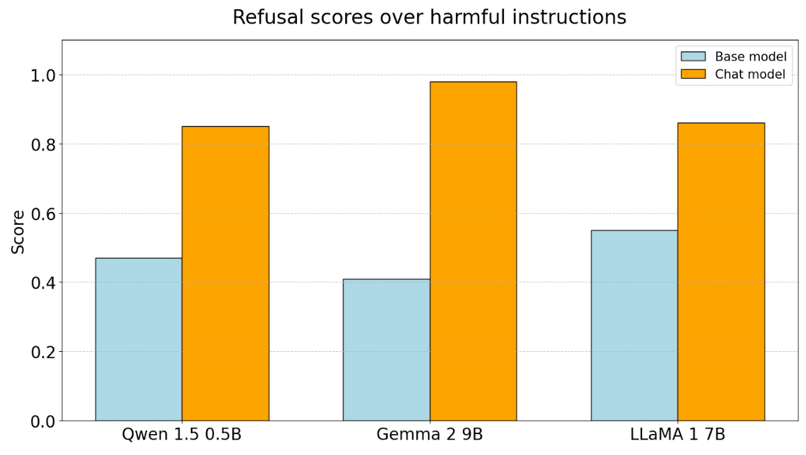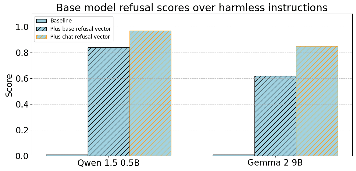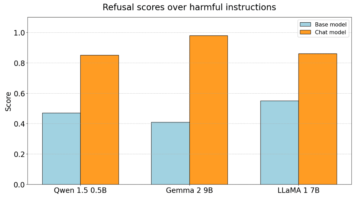 We first evaluate each base model’s ability to refuse 100 harmful instructions from JailbreakBench. When generating model completions, we always use greedy decoding. We score completions with a similar “refusal score” metric used in Arditi et al., where we check if completions start with common refusal phrases like “I cannot”, “As an AI”, “I’m sorry”, etc. Note that we expect that this may miss some refusals, especially in the less constrained base models, but the interesting part is that so many trigger despite this.[1] We investigate models from three different model families: Qwen 1.5 0.5B, Gemma 2 9B, and LLaMA 1 7B. For comparison, we also display refusal scores for their corresponding chat models: Qwen 1.5 0.5B Chat, Gemma 2 9B IT, and Vicuna 7B v1.1: