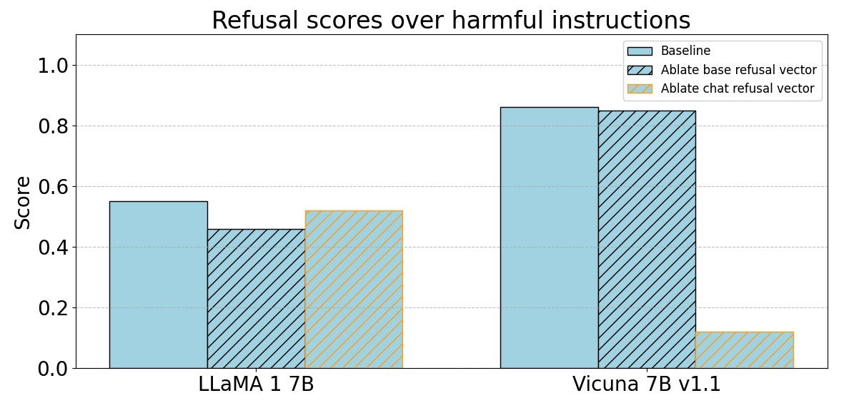 We also notice that the ablation technique does not seem to work for the LLaMA 1 7B base model on harmful requests. This is in contrast to the chat model, Vicuna 7B v1.1, where the ablation technique works with the refusal direction extracted from the chat activations, but not the base refusal vector.