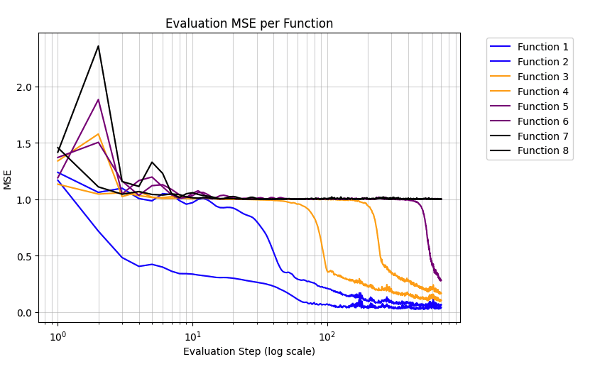 The task is predicting the sign of the product of 1 (function 1) to 8 (function 8) standard normal random variables.
