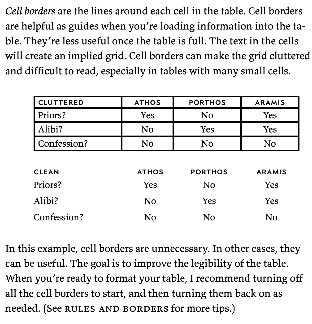 I’m a big fan of Butterick’s book (and Butterick’s stuff in general), and one of the things I appreciate about his guidelines is that he does well at distinguishing between hard-and-fast rules and mere heuristics or suggestions. For example, here, he correctly says: “In this example, cell borders are unnecessary. In other cases, they can be useful.” (Emphasis mine.)