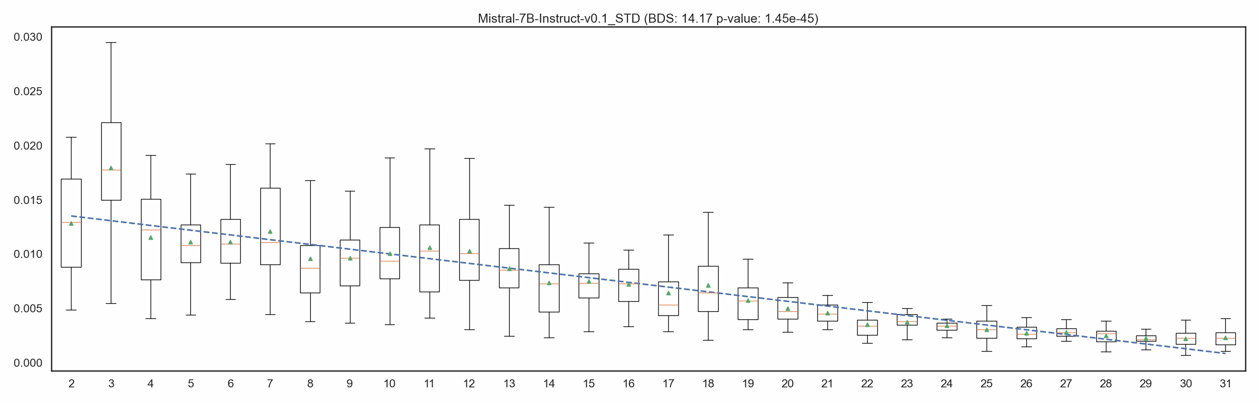 Per‑layer aggregates (across heads) of ESD statistics (mean, standard deviation, skew, excess kurtosis) show a layer dependent trend i.e. . The goal of this post is to show that trends exist, so I report the BDS statistic and p-value[7]. For the actual classification criterion I provide a boxplot[8] and a conceptual description.