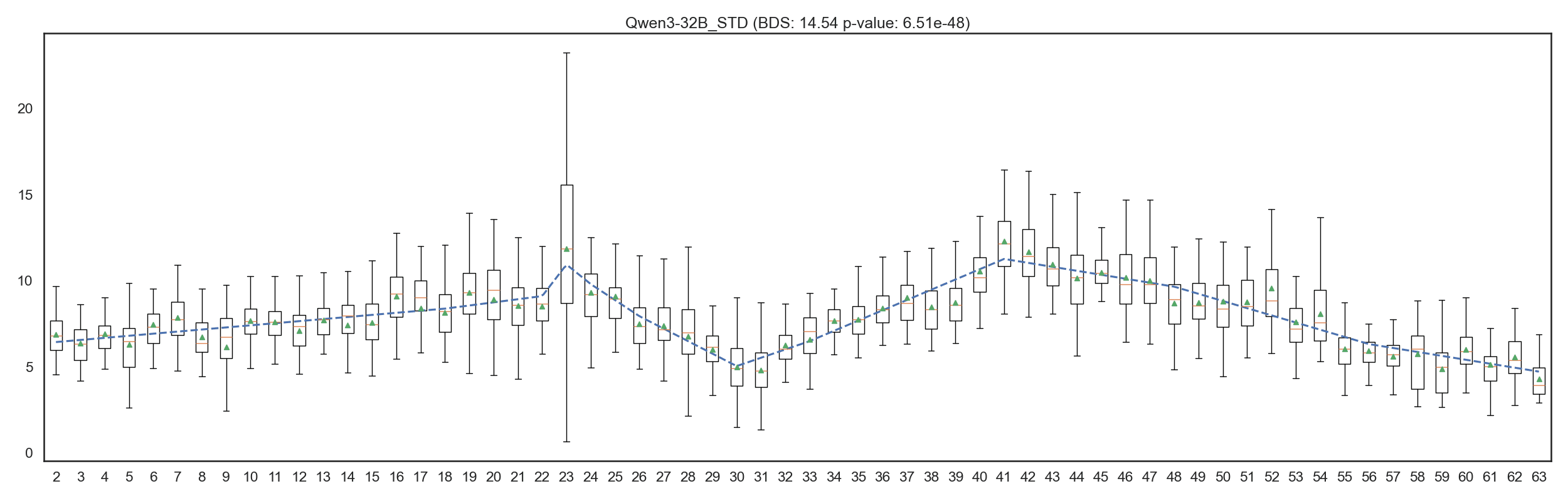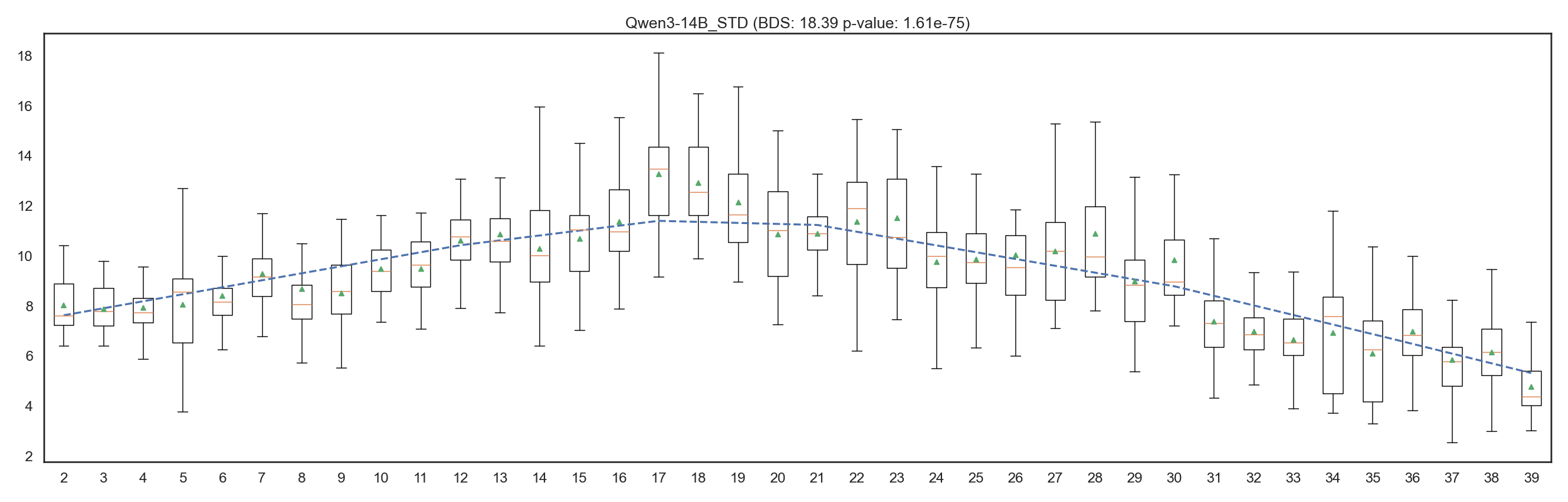 The mean standard deviation of 14B shows a single peak in the middle layers of the model (Layers 18-19), the 32B model has two peaks at Layers 23 and 41. Layers can be classified by the section in which they lie.