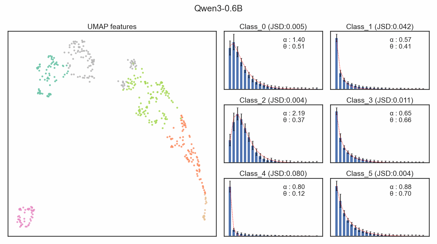 The average distribution within each class follows a gamma distribution (see section below) so each class can be identified by the associated shape parameter and scale parameter . The goodness-of-fit between the calculated average ESD and the fitted Gamma distribution is measured using Jensen-Shannon Divergence (JSD). Across all models studied, the JSD typically lies in the range (0.0-0.1) indicating a very good fit.
