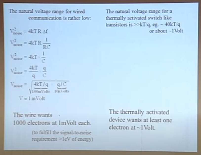 Jacob believes that there is a certain fundamental limit on interconnect losses when we transmit information via voltages on wires—something in the neighborhood of , which he claims is not terribly far from what it is in modern chips (I didn’t check that part). I think he’s wrong that this is a fundamental limit.