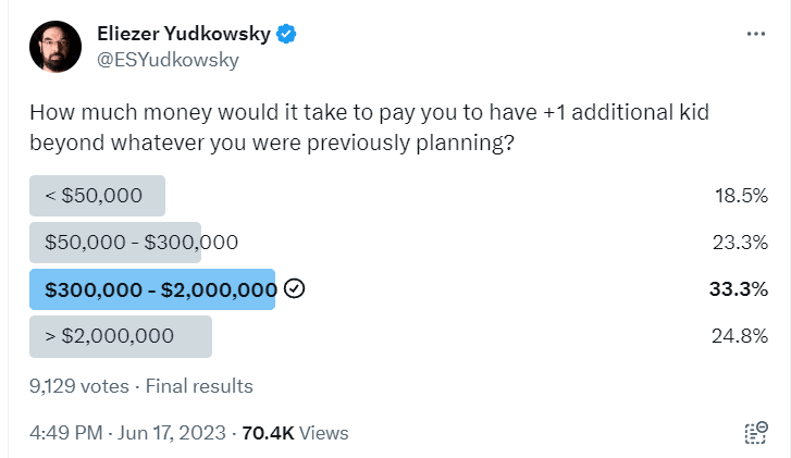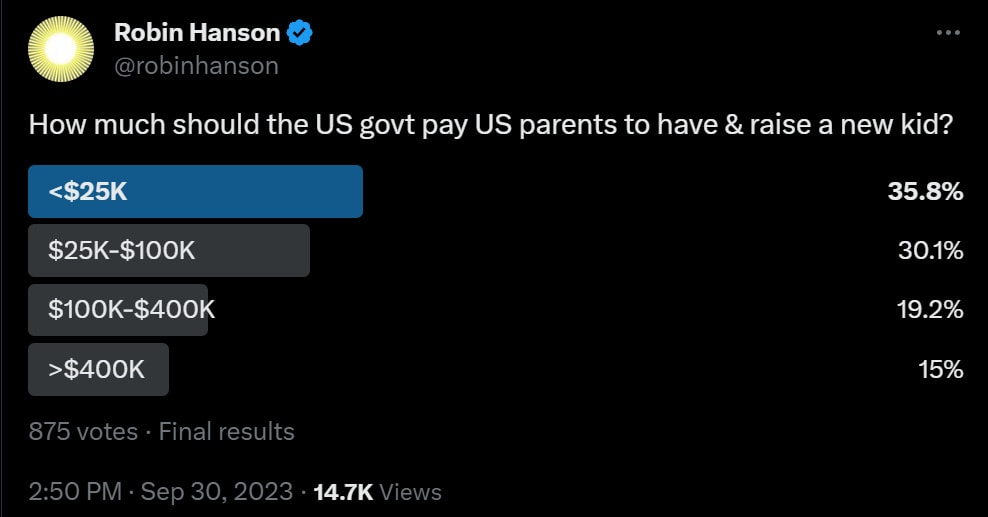 What this does say is that if you used a $50,000 subsidy for each child, in an unusually affluent group, you’d increase fertility by 0.185 for the first child added, which would put the upper bound estimate at around $450k per birth, already lower than $555k. Presumably then many of those same people would also add a second additional child, and some others would use the wealth endowment from current children to have another. In the general population the required value would doubtless be a lot lower, and the targeting can be improved. This is not obviously so different from my old $275k estimate right off the bat.