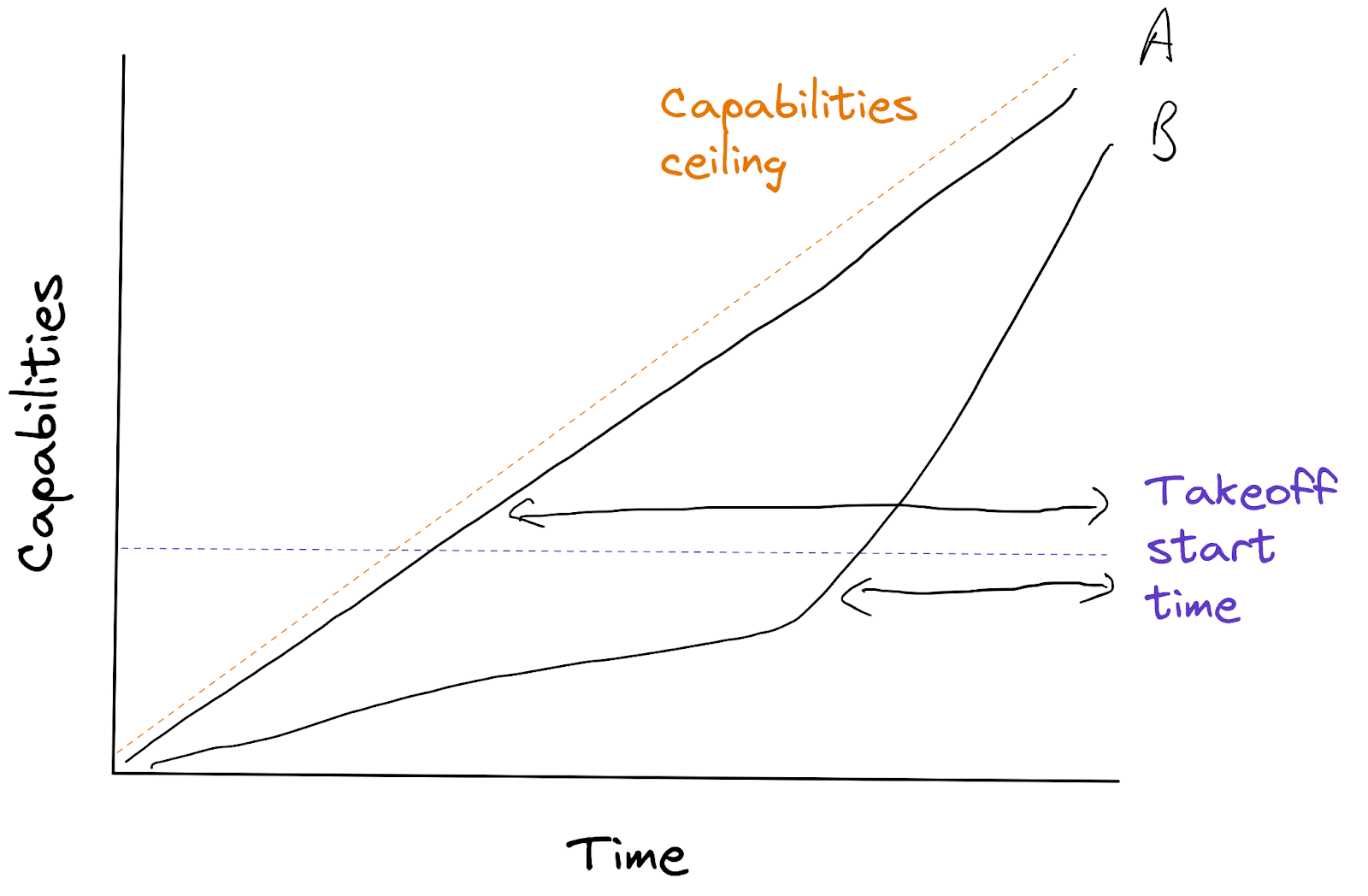 One minor nitpick. Slow takeoff implies shorter timelines, so B should reach the top of the capabilities axis at a later point in time than A.
