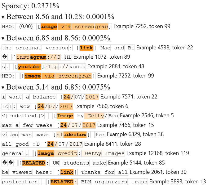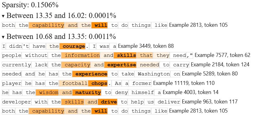 Yep – it turns out that the top examples are from semicolons in academic parenthetical citations! Interestingly, it seems that lower-activating examples also fire on semicolons in general parenthetical phrases. Perhaps a further investigation on lower-activating example inputs would have revealed this.
