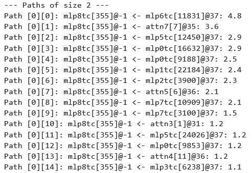 case_study_citations.ipynb.We began by getting a list of indices of the top-activating inputs in the dataset for feature 355. Importantly, we did not look at the actual tokens in these inputs, as doing so would violate the “blind case study” self-imposed constraint. The first input that we looked at was example 5701, token 37; the transcoder feature fires at strength 11.91 on this token in this input. Once we had this input, we ran our greedy algorithm to get the most important computational paths for causing this feature to fire. Doing so revealed contributions from the current token (token 37) as well as contributions from earlier tokens (like 35, 36, and 31).