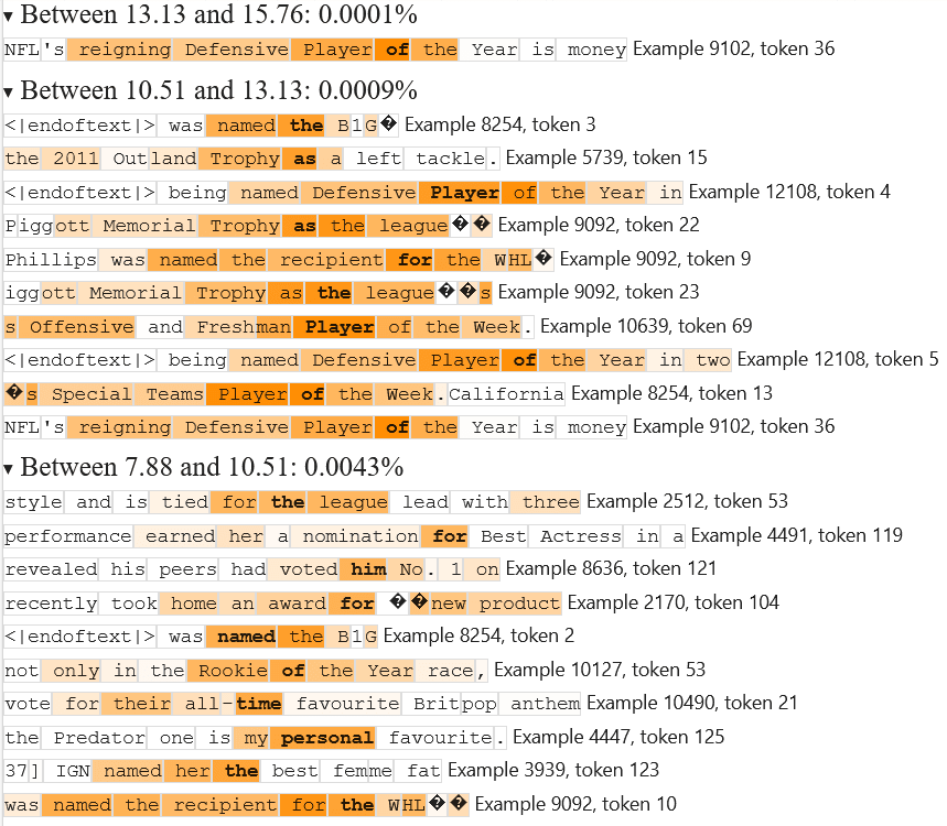 At this point, we decided to end the “blind” part of our blind case study and look at the feature’s top activating examples in order to evaluate how we did. Here are the results: