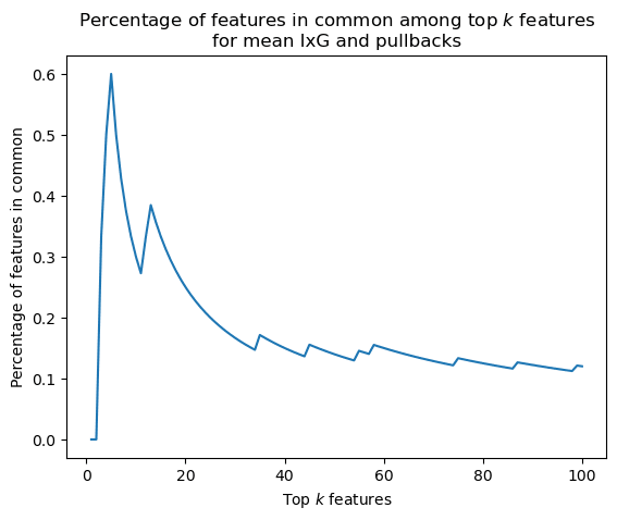 To investigate this, we performed the following experiment. We are given a later-layer transcoder feature and an earlier-layer transcoder. We can use the pullback to obtain a ranking of the most important earlier-layer features for the later-layer feature. Then, on a dataset of inputs, we calculate the mean input-dependent attribution of each earlier-layer feature for the later-layer feature over the dataset. We then look at the top k features according to pullbacks and according to mean input-dependent attributions, for different values of k. Then, to measure the degree of agreement between pullbacks and mean input-dependent attributions, for each value of k, we look at the proportion of features that are in both the set of top k pullback features and the set of top k mean input-dependent features.