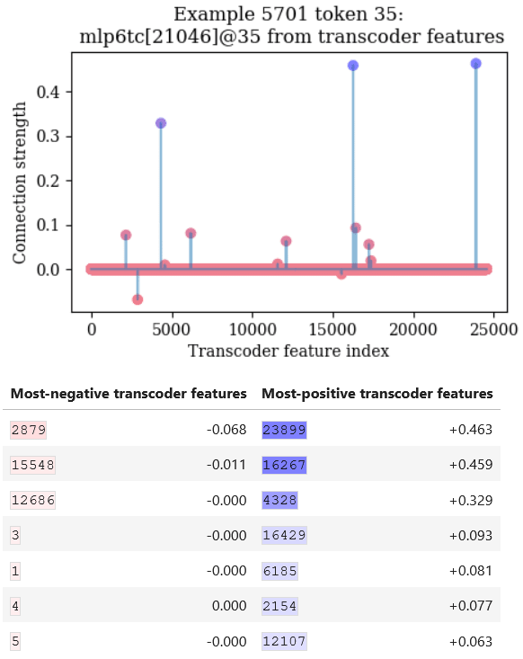 We can use the above techniques to determine which earlier-layer transcoder features are important for causing a later-layer transcoder feature to activate. But then, once we have identified some earlier-layer feature i that we care about, then we can understand what causes feature i to activate by repeating this process, looking at the encoder vector for feature i in turn and seeing which earlier-layer features cause it to activate.
