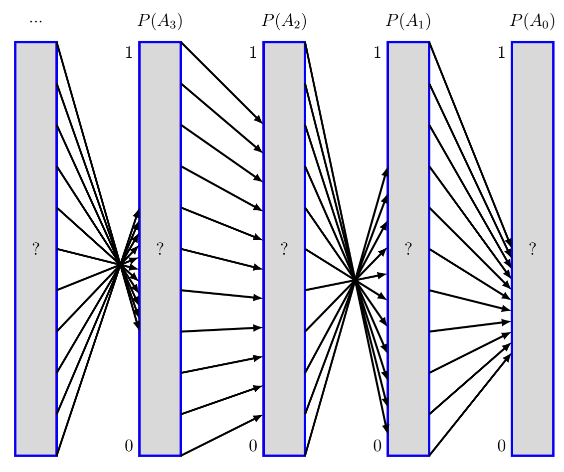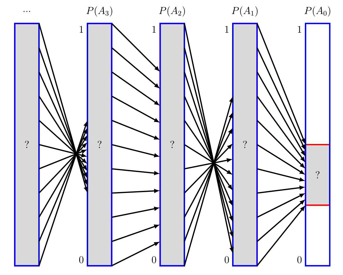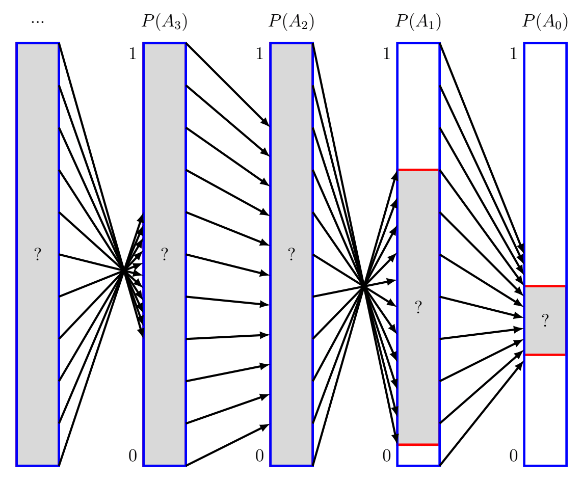 It would be really nice if this intersection contained only a single element, i.e. our chain of conditional probabilities actually specified a value of . When does that happen? Well, will shrink any input interval by a factor of , so if Alice wants to actually get a single answer for then she needs , or equivalently[3] .