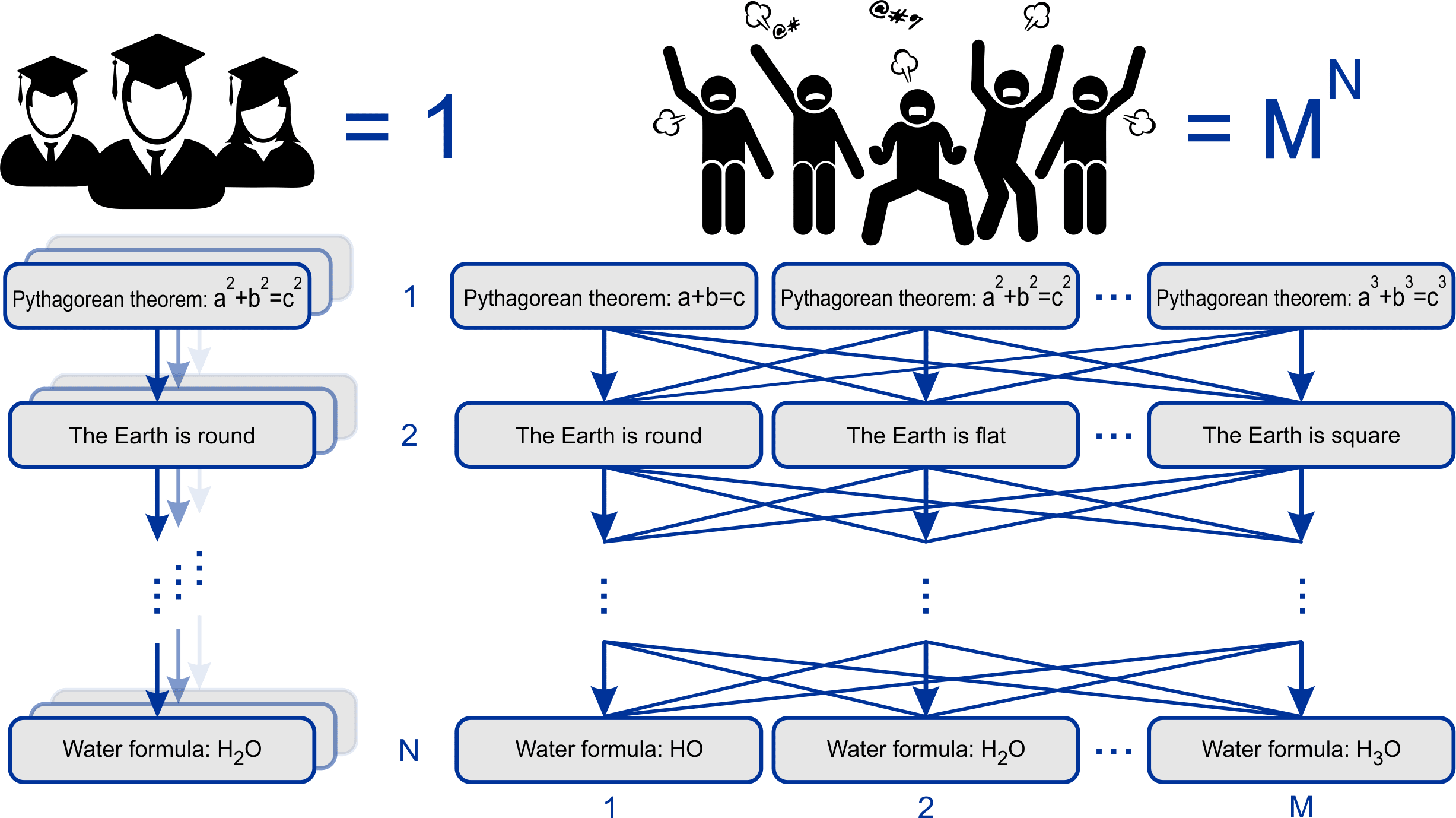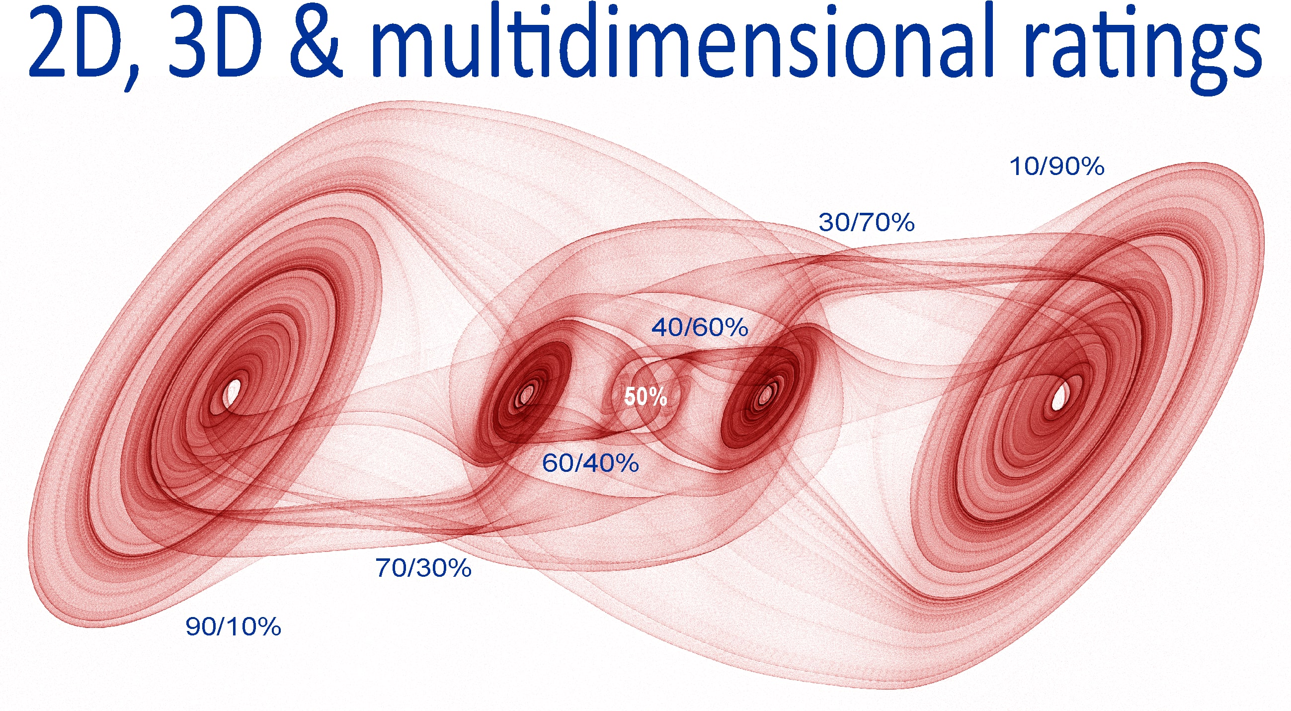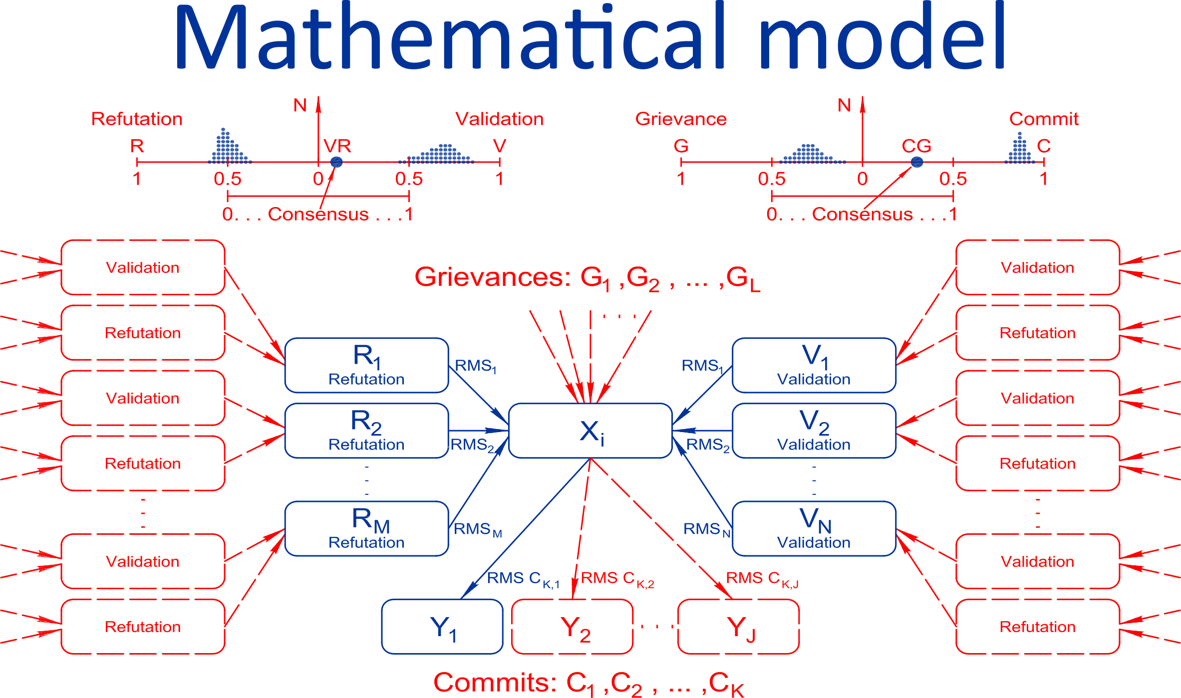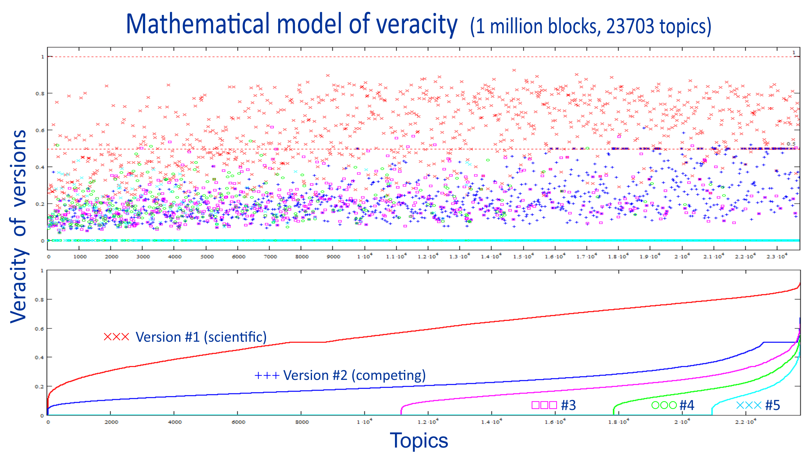As the results of mathematical modeling of the algorithm show, after creating of a million information blocks on various topics, each of which on average has three or more competing versions, since any topic can always have at least three hypotheses: the dominant, outdated and new promising hypothesis that is replacing the dominant one, the first (red) version #1, which is defended by the scientific community, thanks to Popper's falsifiability criterion, systematically wins the credibility rating over competing versions of ignorames, bots and trolls. And all these hypotheses form a space of meanings with veracity greater than 0 and less than 1 with the overall picture of opinions normalized to a total sum of 100%.