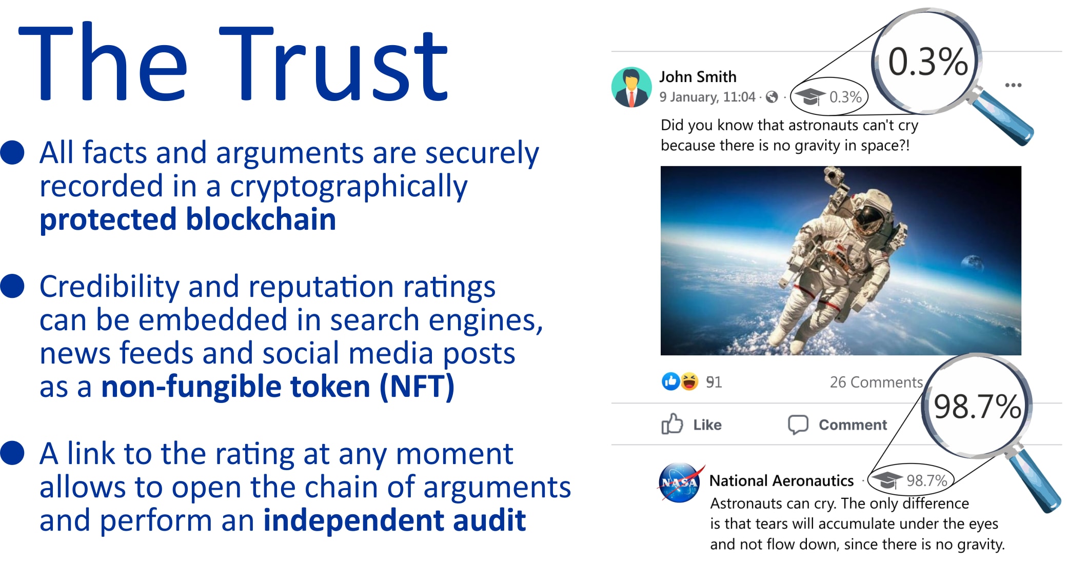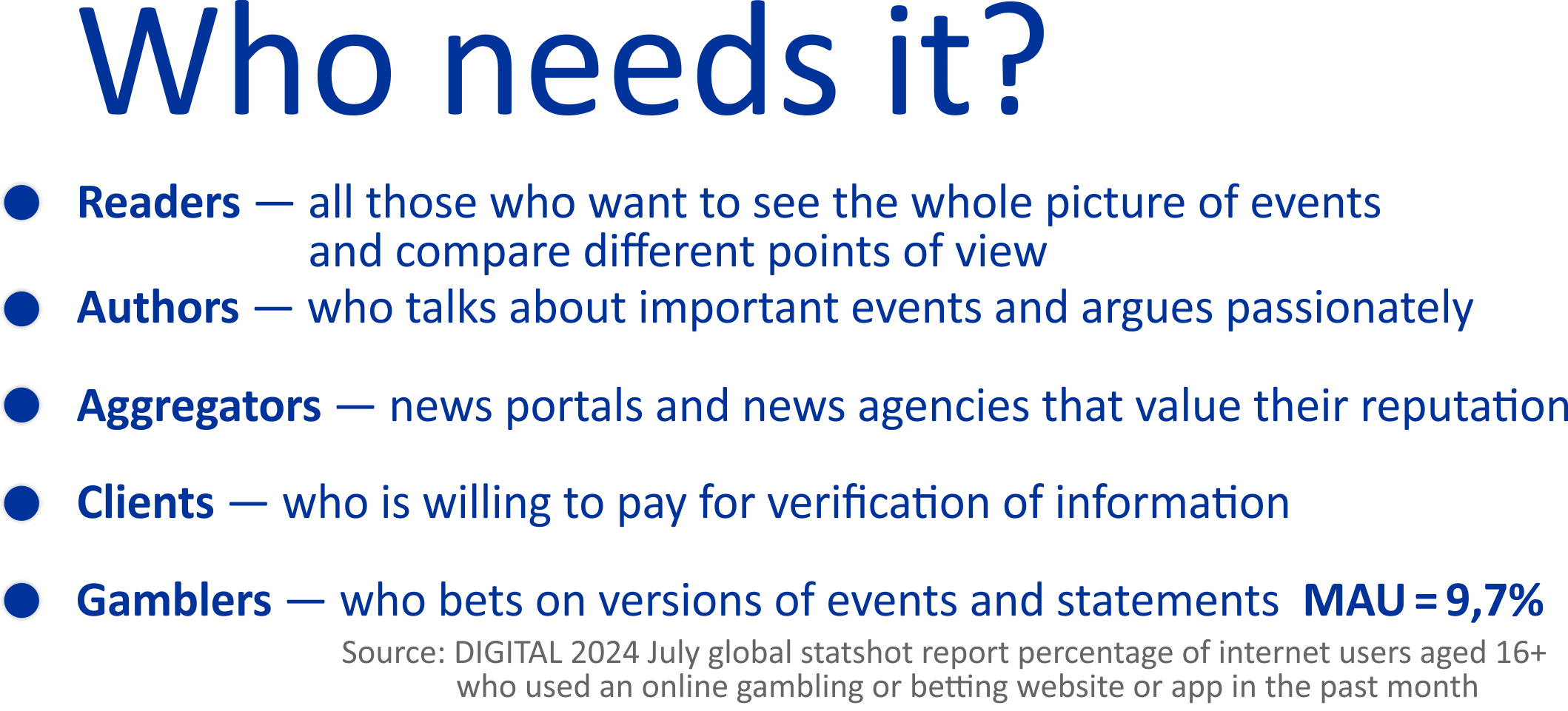 This is a global problem. There is a huge number of fakes on the Internet, artificial content created in enormous amounts by neural networks is becoming more and more realistic and will soon be indistinguishable from the real one, factchecking is becoming more and more expensive every day and in the increasing amount of information it is more and more difficult to distinguish truth from falsification, but we do not have the tools to check the veracity and filter truth from lies. Internet users around the world are confused and disoriented, many say they don't know where the truth is, society is polarized, all this causes a crisis of trust and limits the development of decentralized organizations.