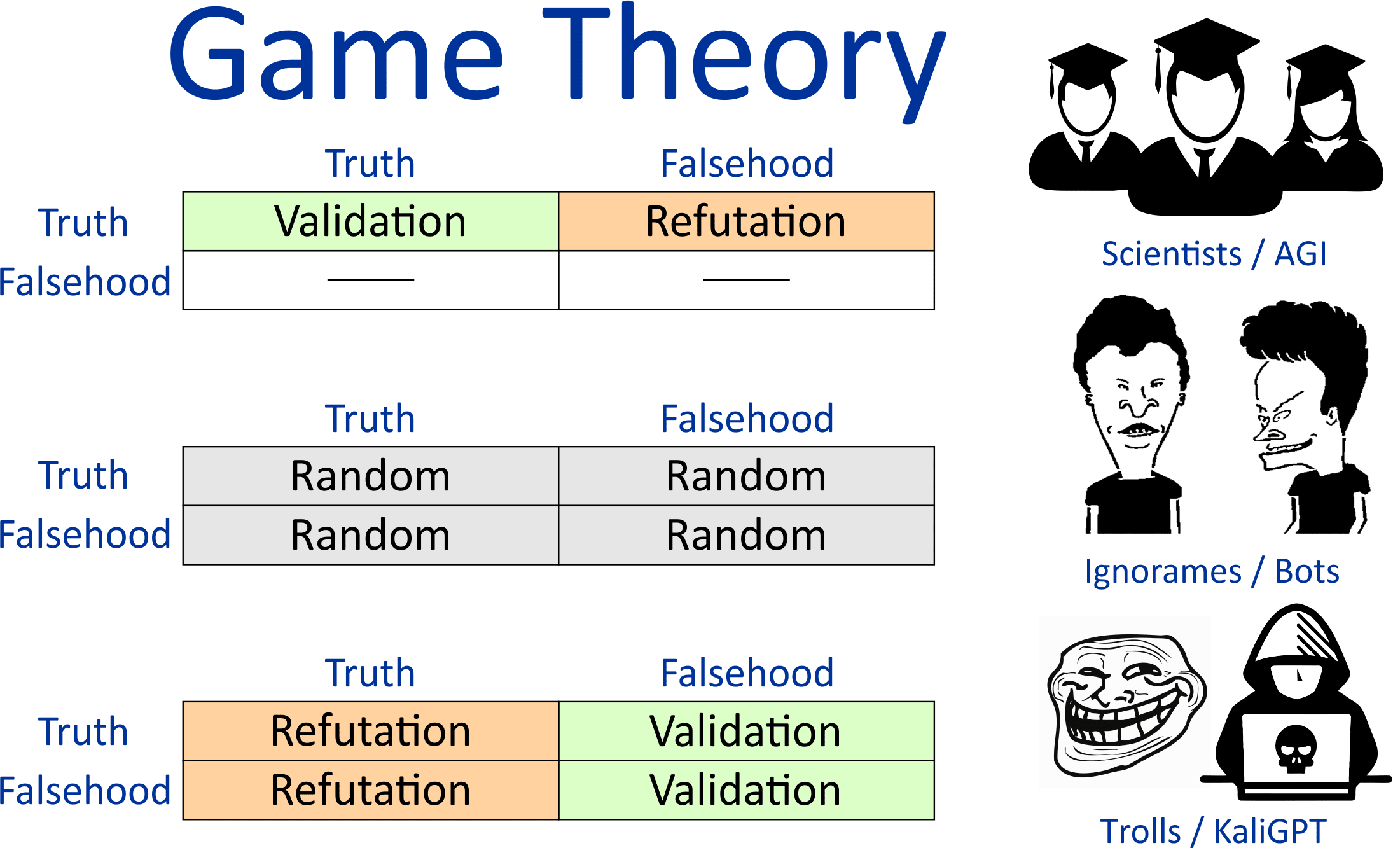 The game theory of the system is based on the fact that in accordance with their ethical principles, scientists defend only the scientific version of each controversial topic, while trolls and hackers try to do harm and in accordance with their counter strategy deliberately refute scientific knowledge and prove all other versions except the scientific one. At the same time the rest of the users have lack of quality knowledge, fluctuate between different points of view and periodically confirm/refute one version or the other. Since ignorames and bots do not have a shared collective coordination system for mutual verification and identification of reliable knowledge, similar to the one that exists in the global scientific community and international education system, ignorames, bots and trolls inevitably come into conflict with each other on issues of different viewpoints on versions of events, and as a result, scientific versions, which are jointly defended by the scientific community, get a strategic advantage over chaotic contradictory viewpoints and fakes, mutually disproving each other.