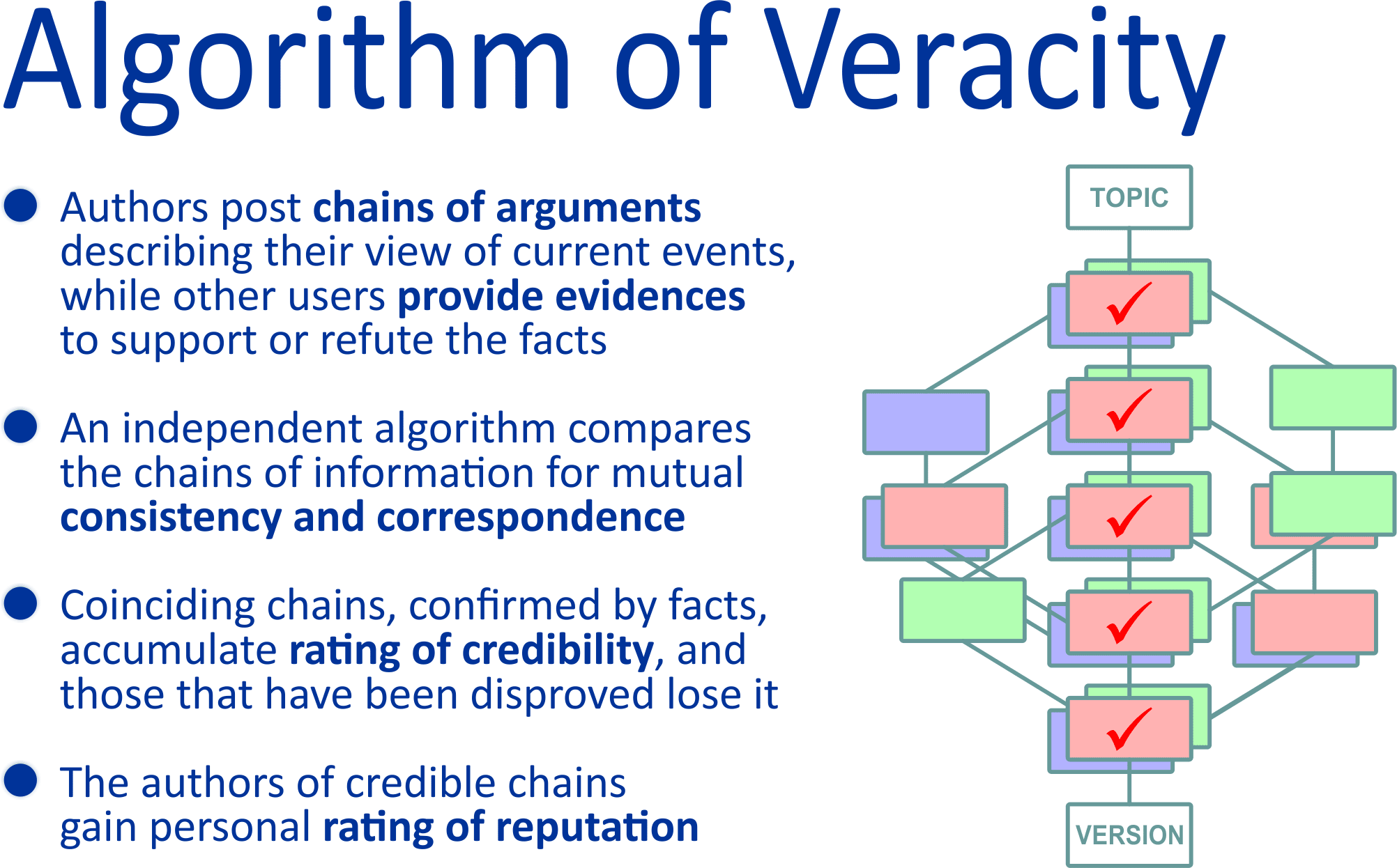 — it is built on a blockchain with an independent mathematical algorithm for analysis of the veracity of arguments on the basis of graph theory with auto-translation of content into 109 languages