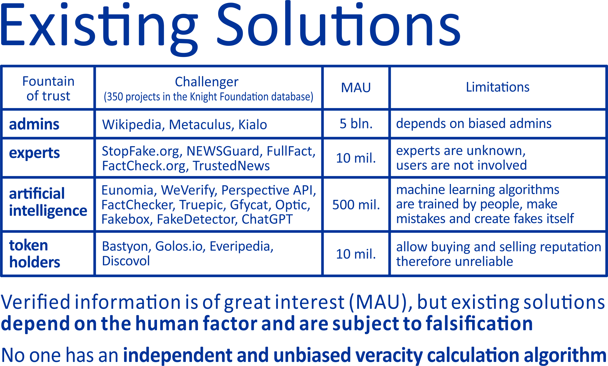 Experts know of hundreds of projects that have tried to determine veracity using various methods of authoritarian administration of content, using hallucinating artificial intelligence algorithms or voting tokens that allow to bribe any user, but since 2018, experts have recognized that all these approaches are biased, falsifiable and have failed themselves.