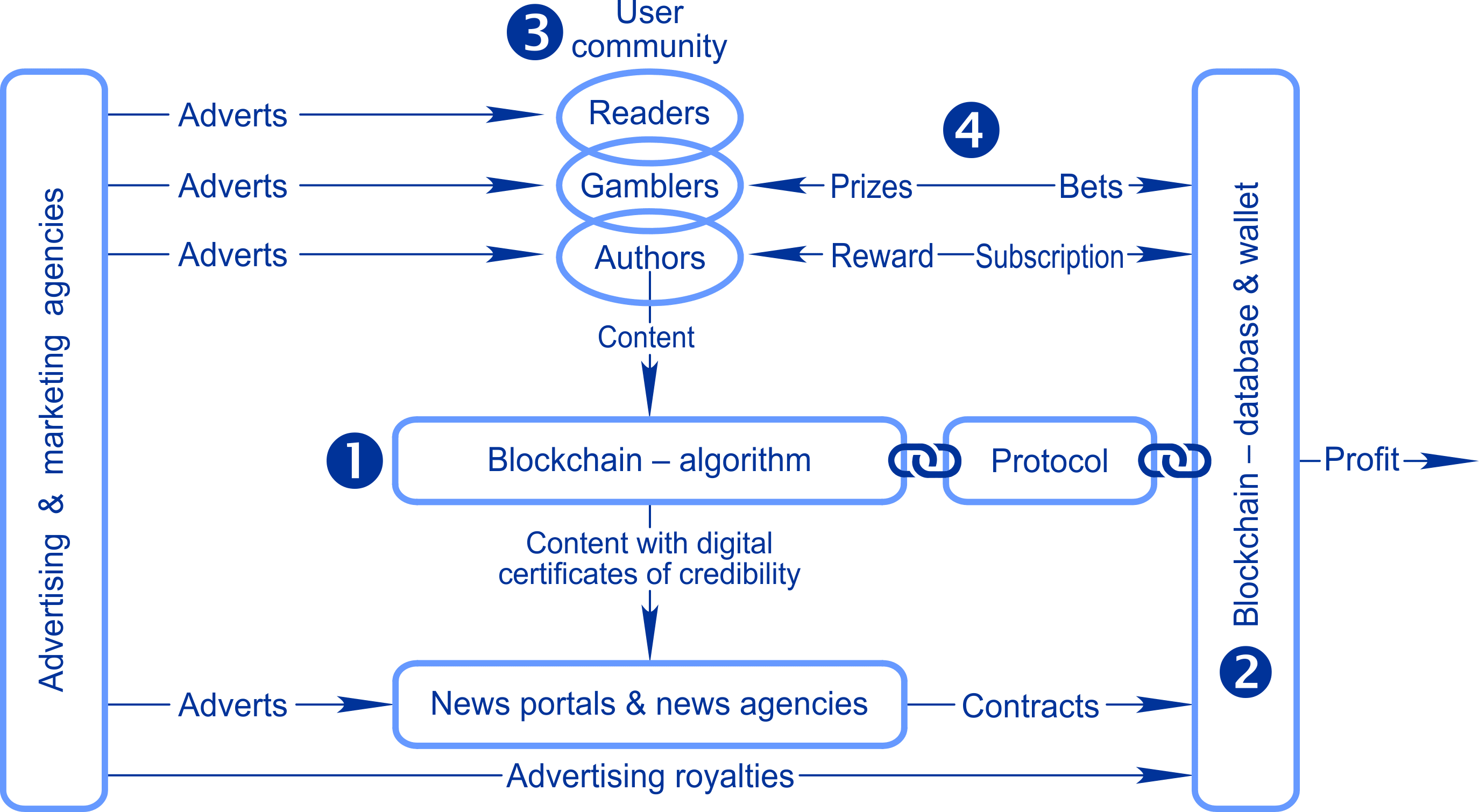 To these authors, the smart contract automatically pays a reward from revenues from corporate and private orders to analyze reliable information, which encourages authors to search and publish new evidences. According to this picture, the more bots and trolls publish — the even better. They get exponentially confused and drown in the information noise they themselves generate.